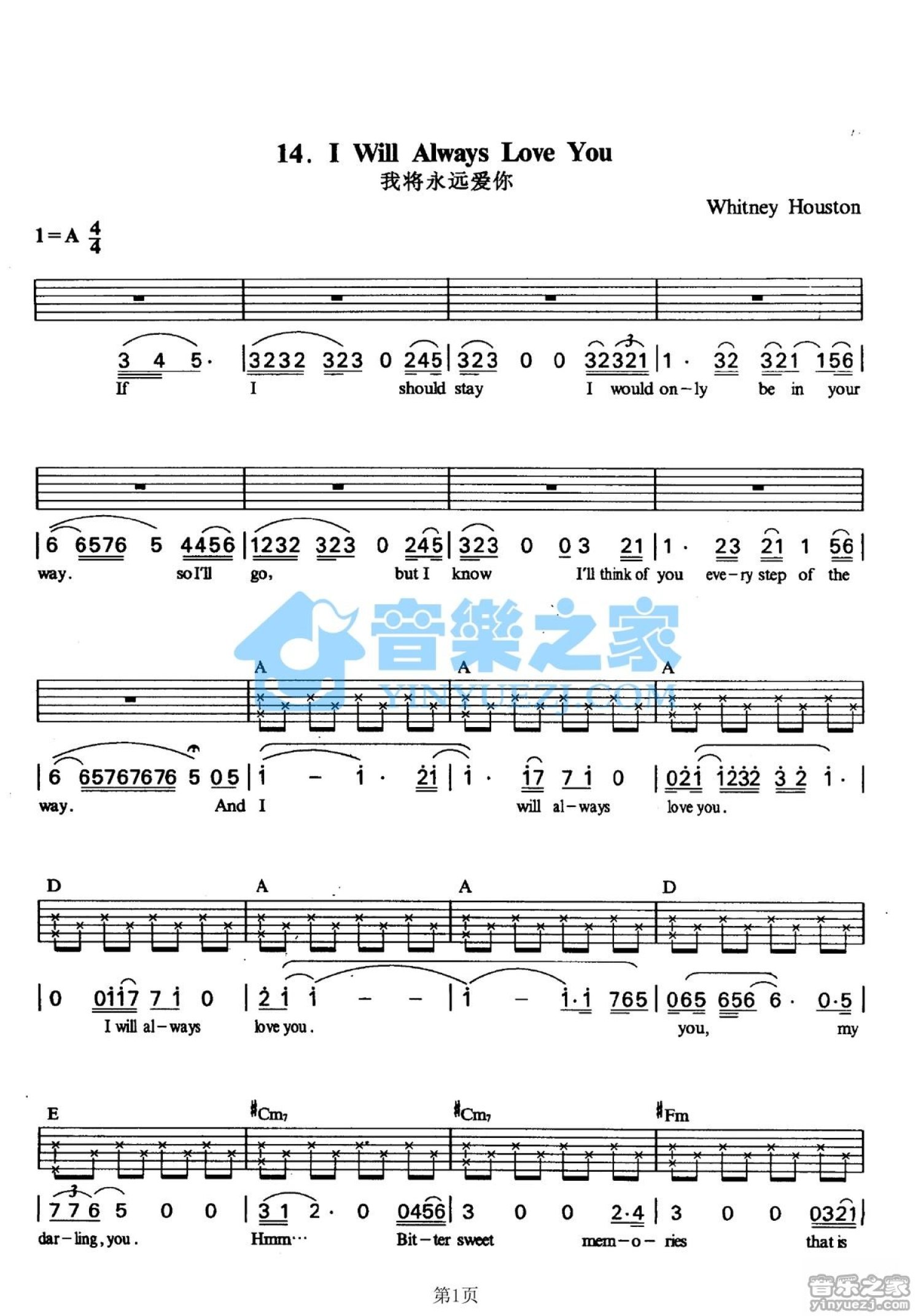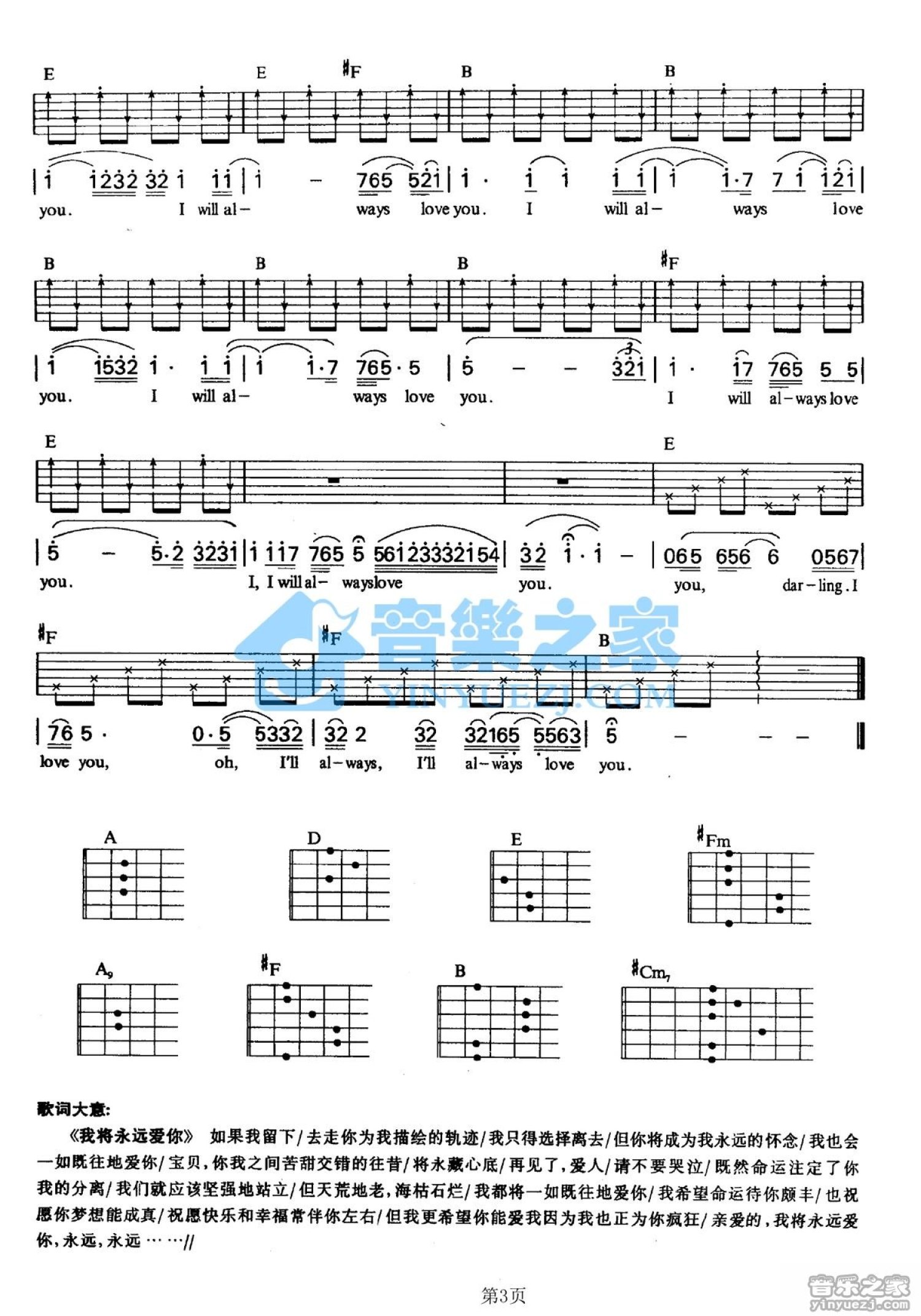 曲谱介绍: A调版《IWillAlwaysLoveYou》吉他弹唱六线谱