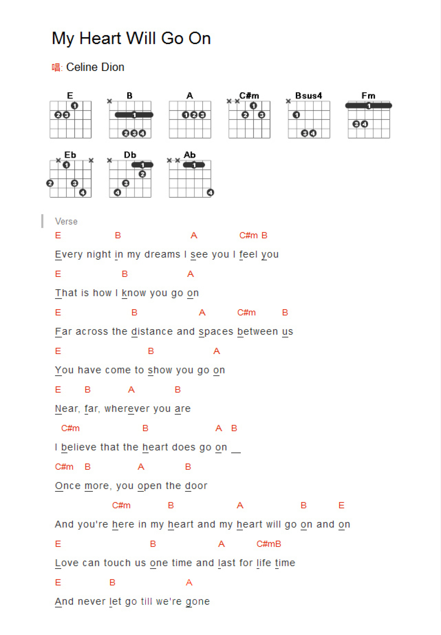 曲谱介绍: 《myheartwillgoon》吉他和弦弹唱谱