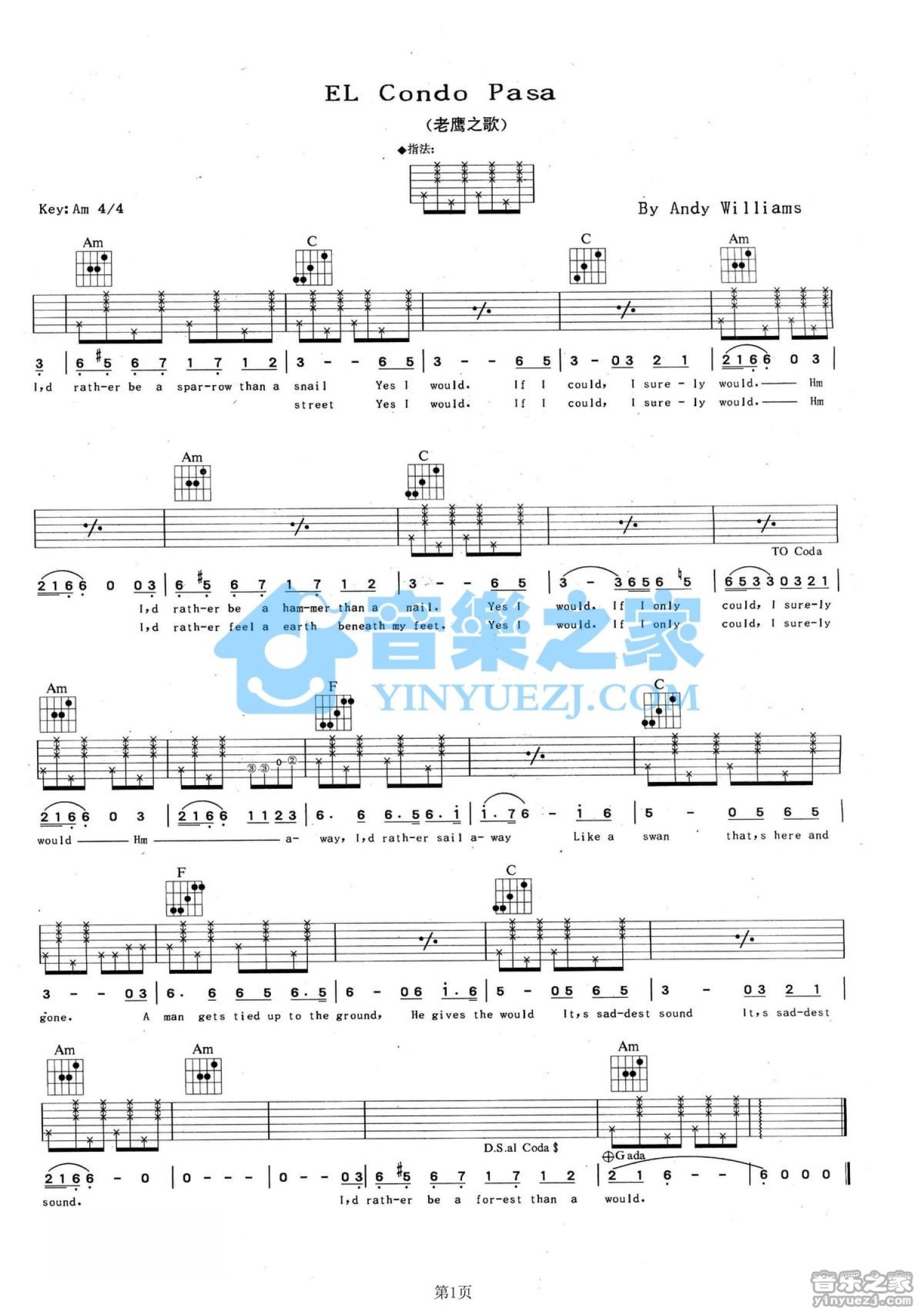 曲谱介绍: Am调版《ELCondoPasa》(老鹰之歌)吉他弹唱六线谱
