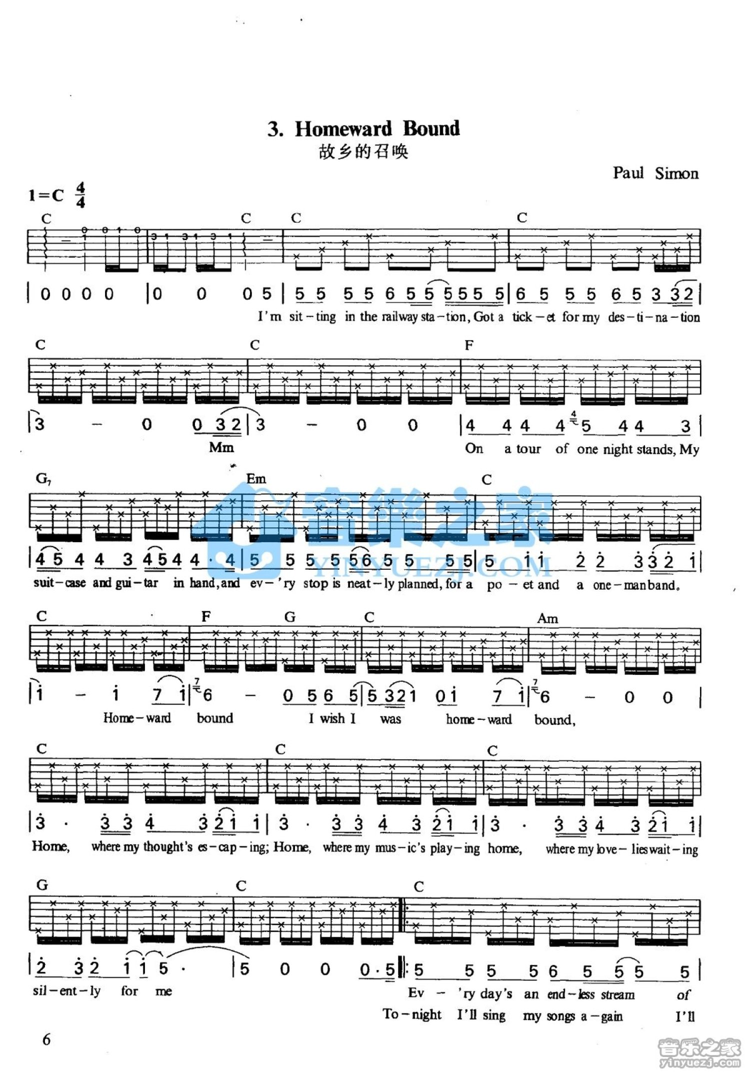 曲谱介绍: C调版paulsimon《HomewardBound》吉他弹唱六线谱