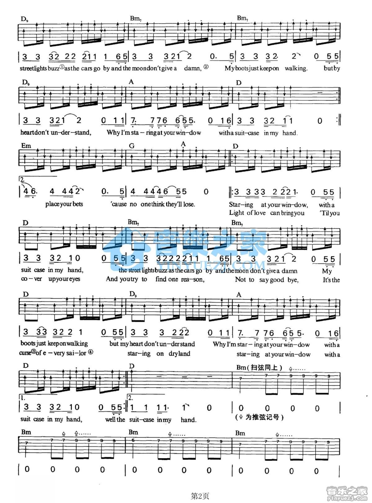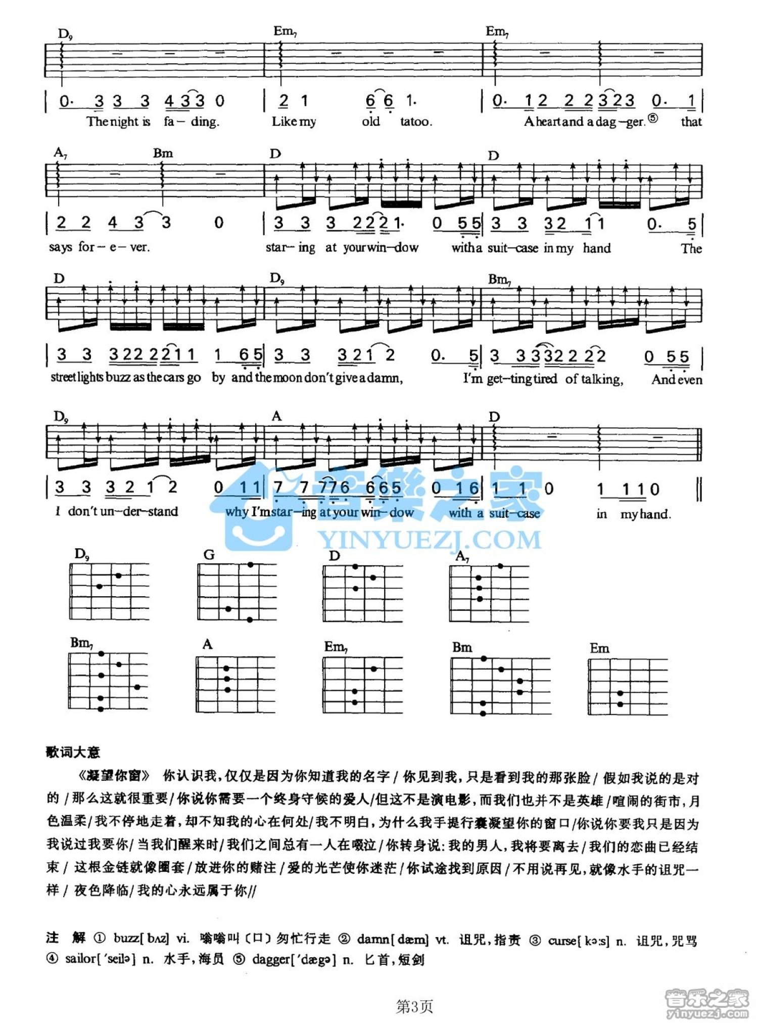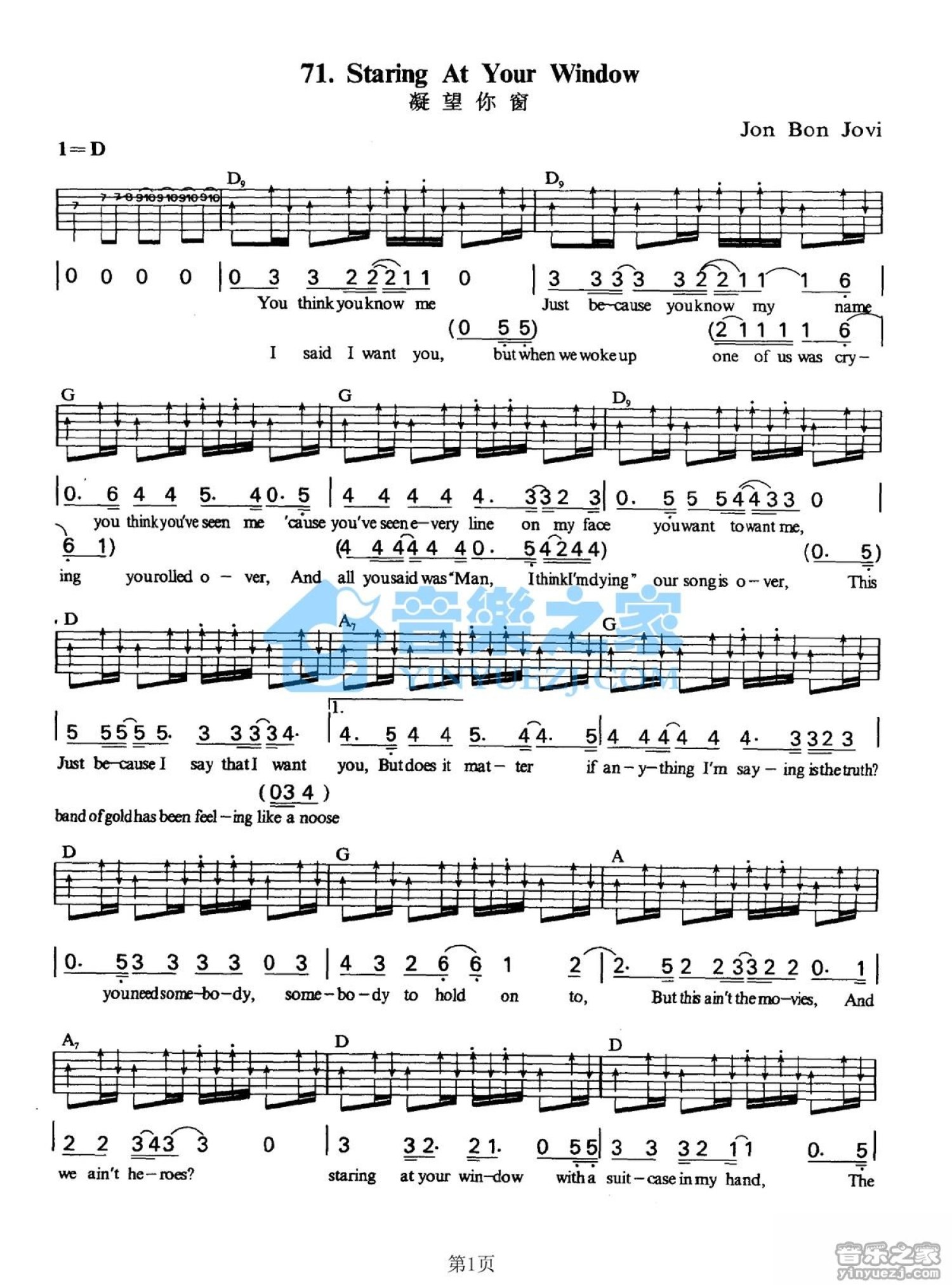 曲谱介绍: D调版《StaringatYourWindow》吉他弹唱六线谱