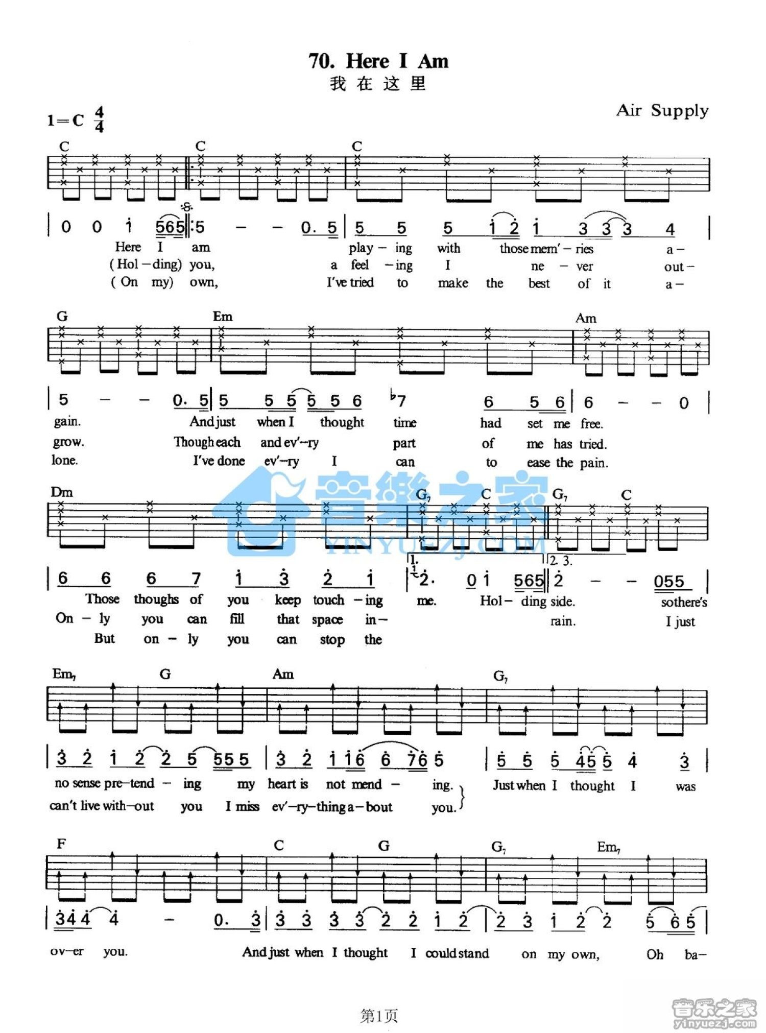 曲谱介绍: C调版AirSupply《HereIAm》吉他弹唱六线谱