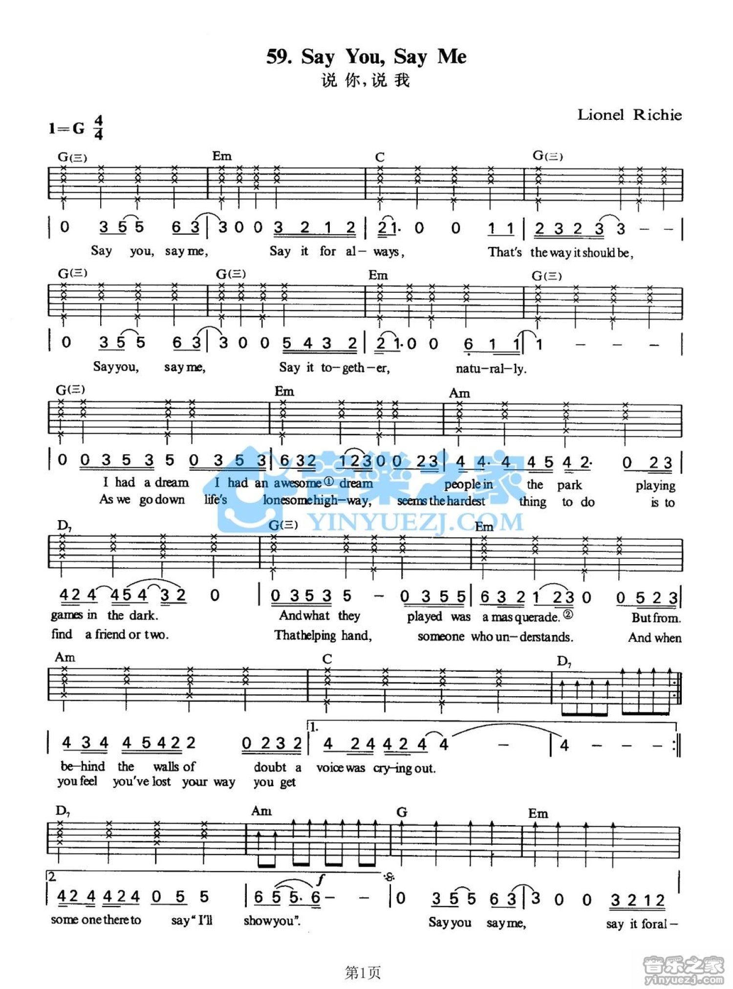 曲谱介绍: G调版LionelRichie《SayyouSayMe》吉他弹唱六线谱