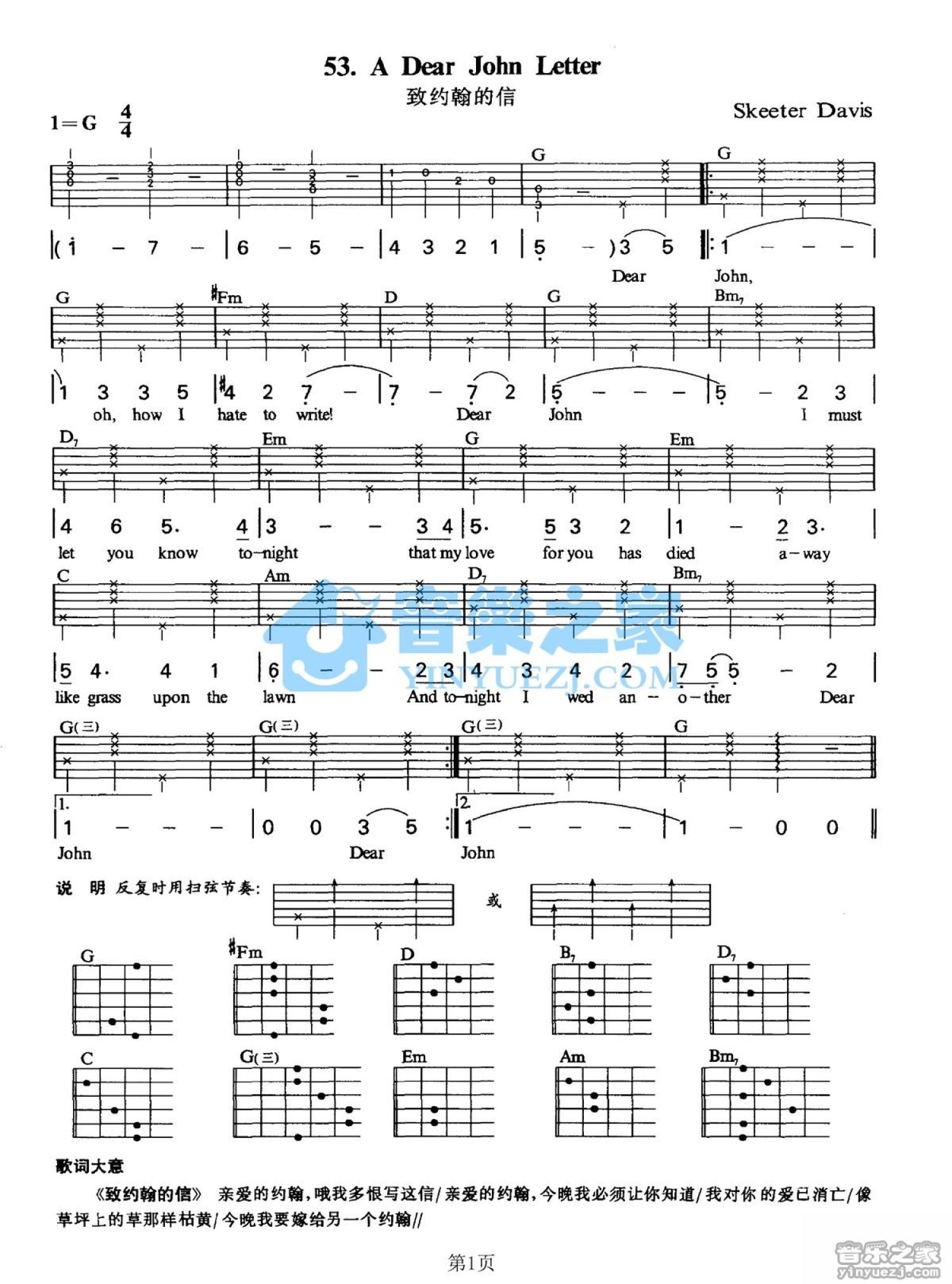 曲谱介绍: G调版 《A Dear John Letter》吉他弹唱六线谱