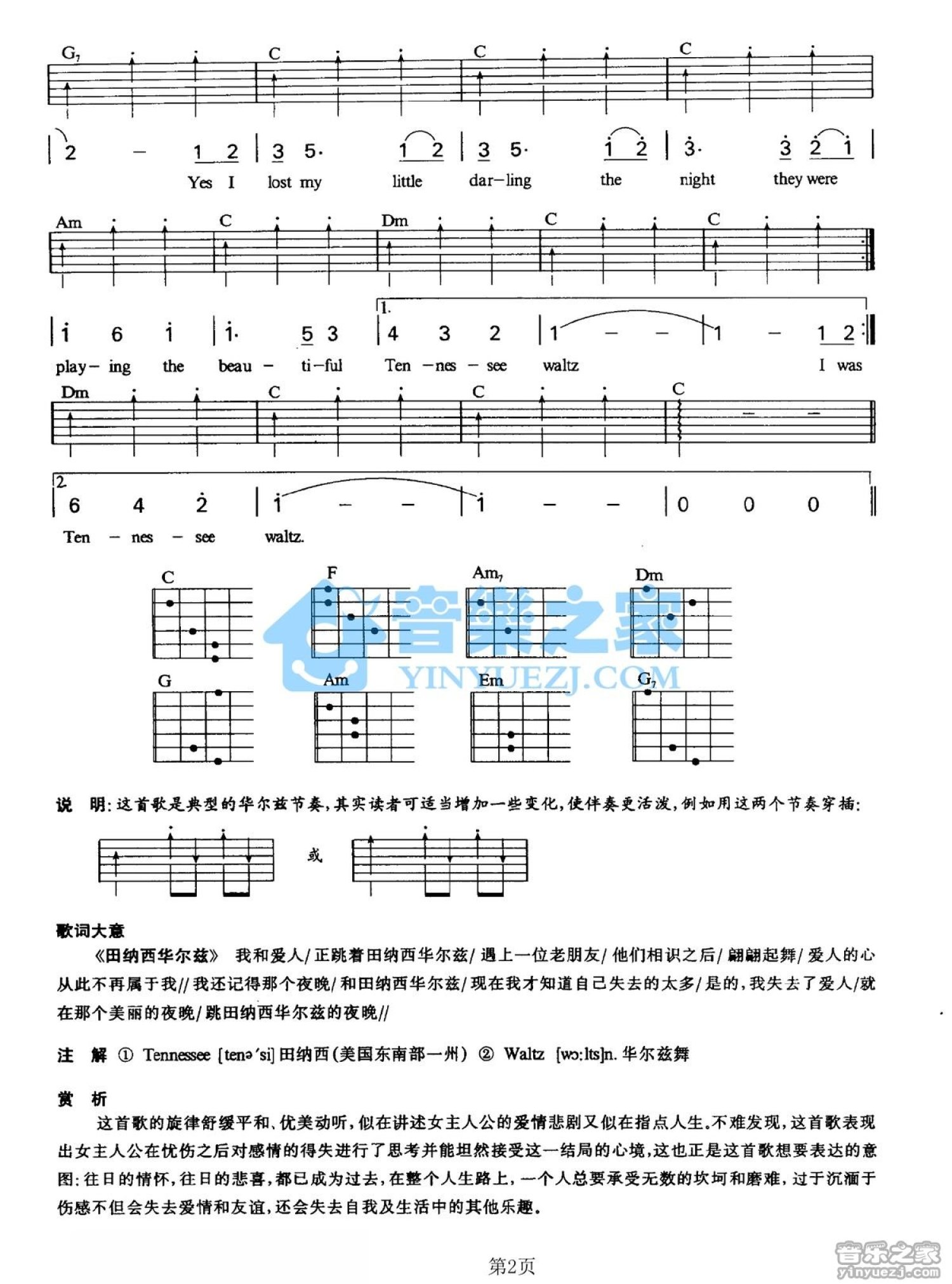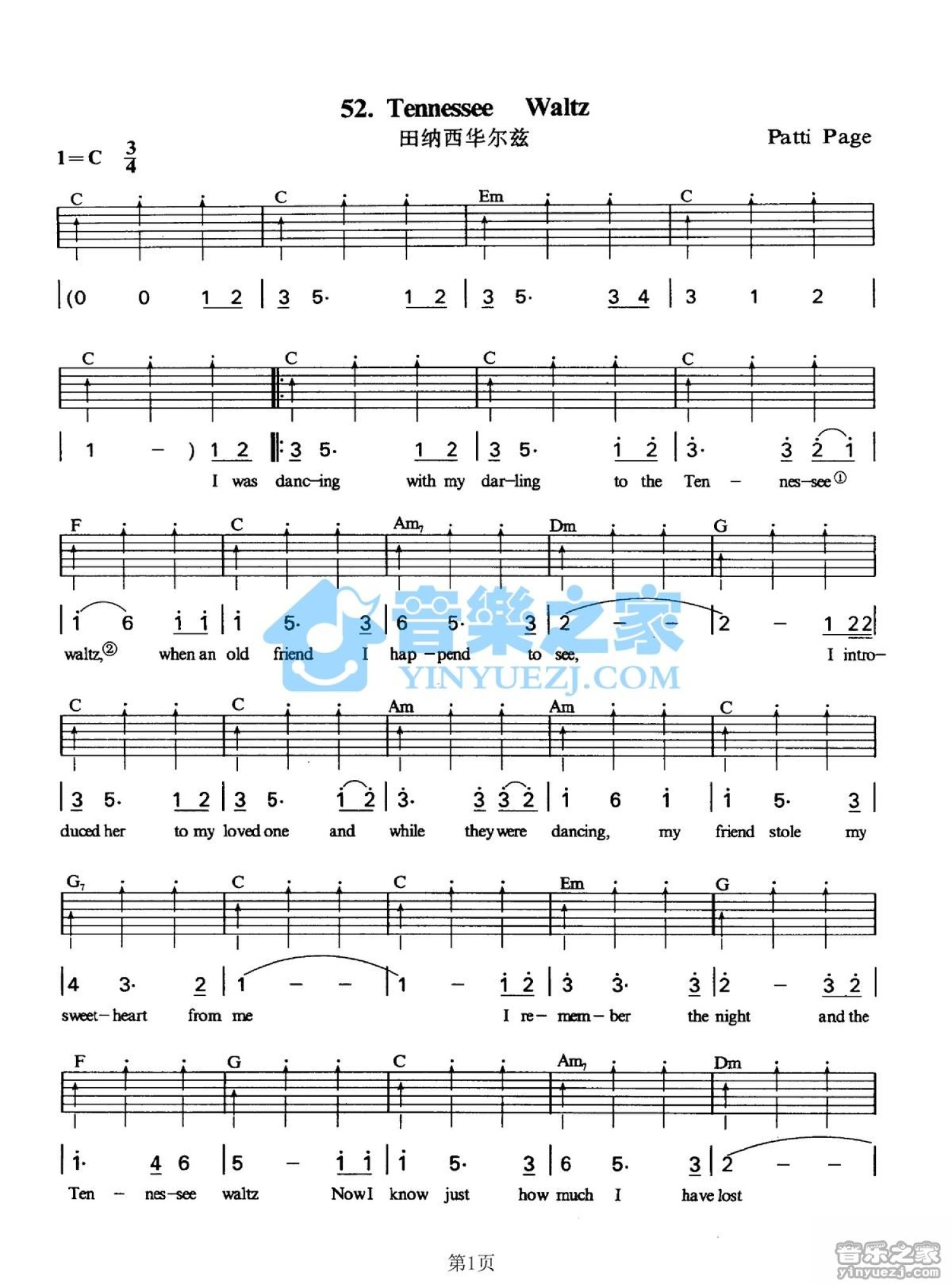 曲谱介绍: C调版PattiPage《TennesseeWaltz》吉他弹唱六线谱