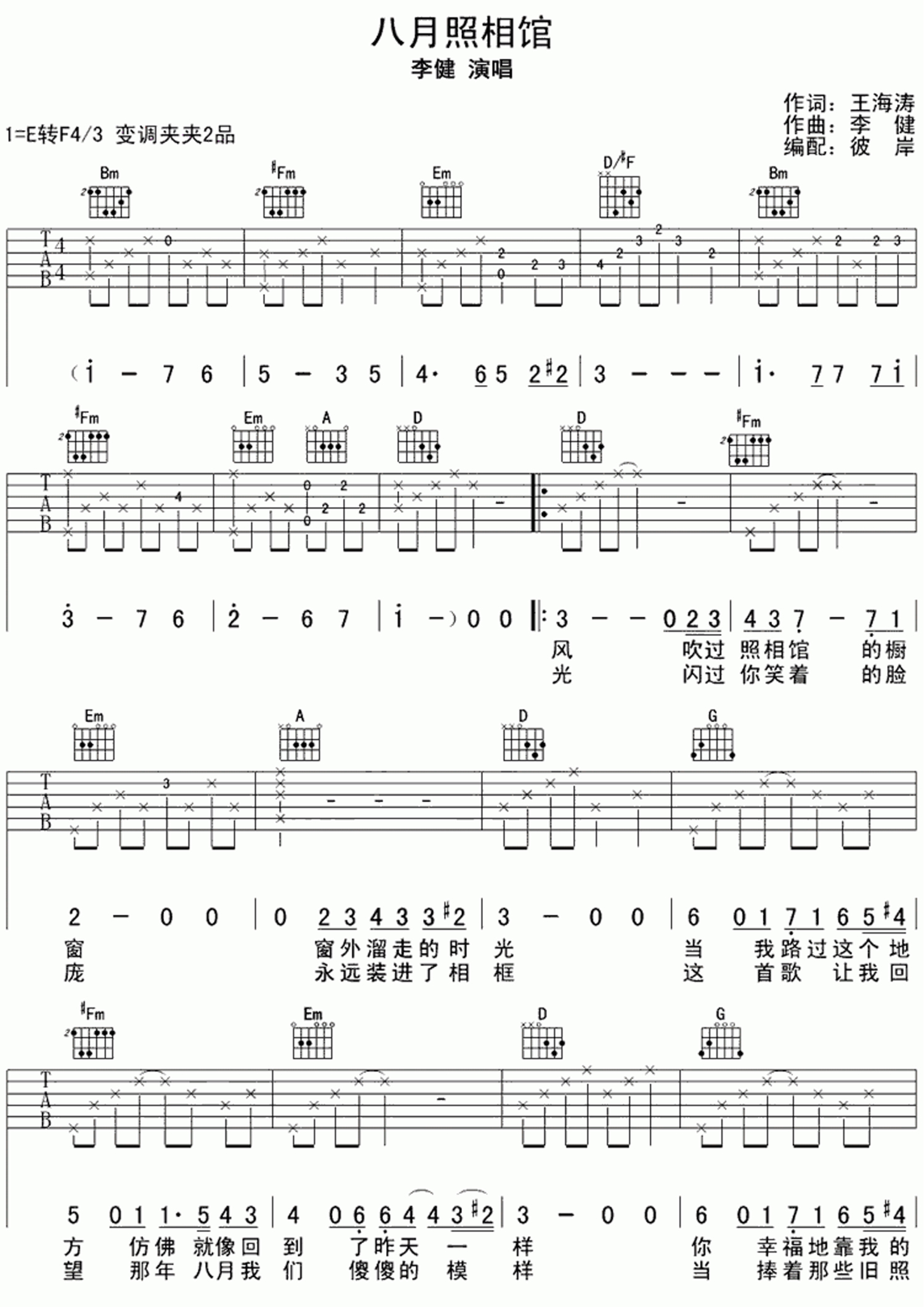 八月照相馆吉他谱 - 李健 - E调吉他弹唱谱