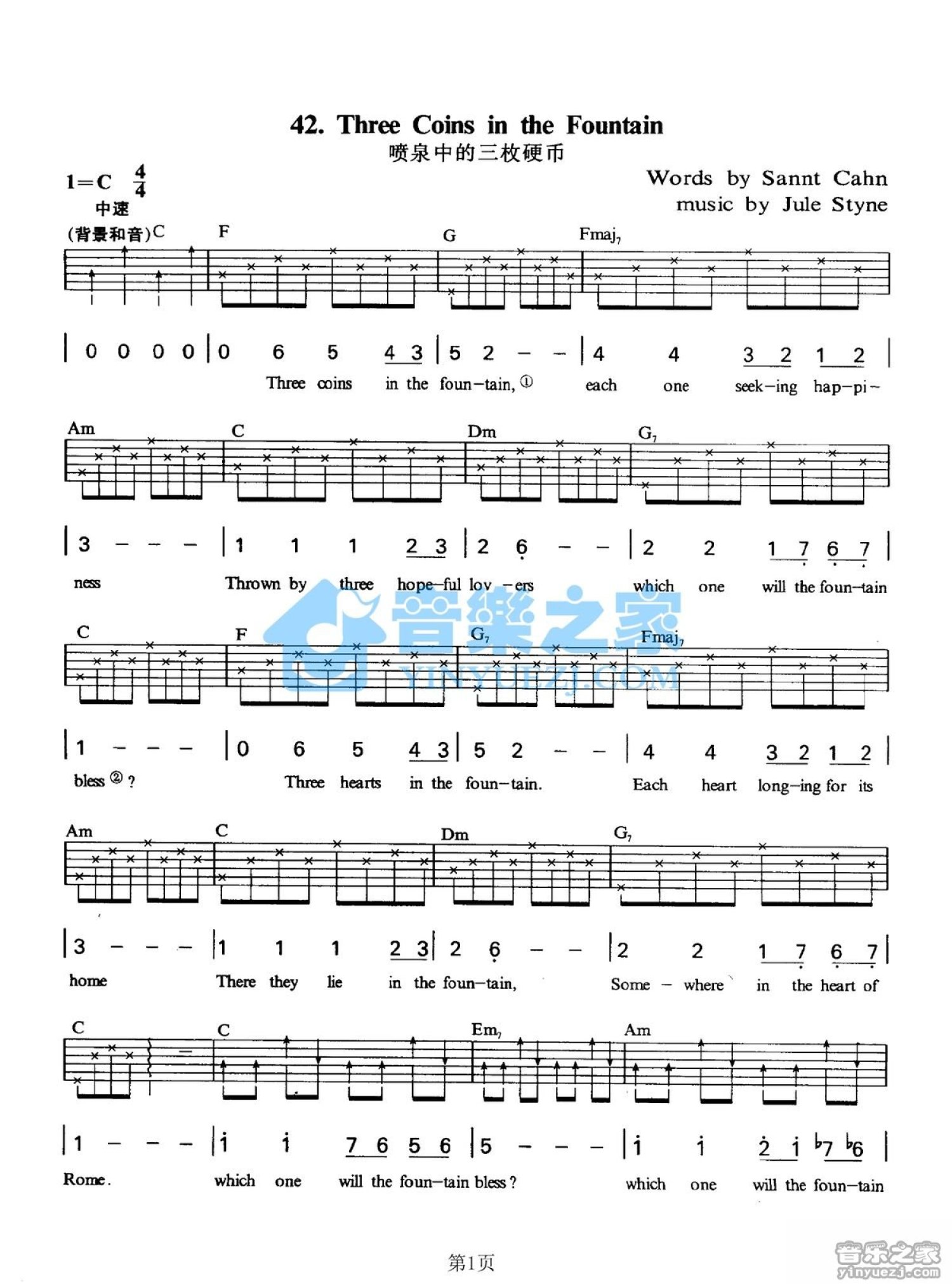 当前位置:琴谱网>吉他弹唱>hree Coins In The Fountain