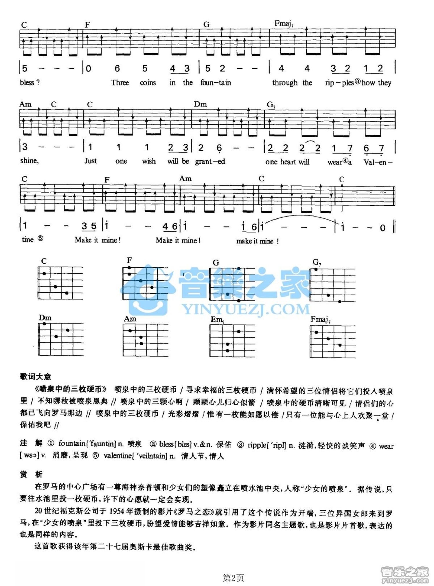 曲谱介绍: C调版《hreeCoinsInTheFountain》吉他弹唱六线谱