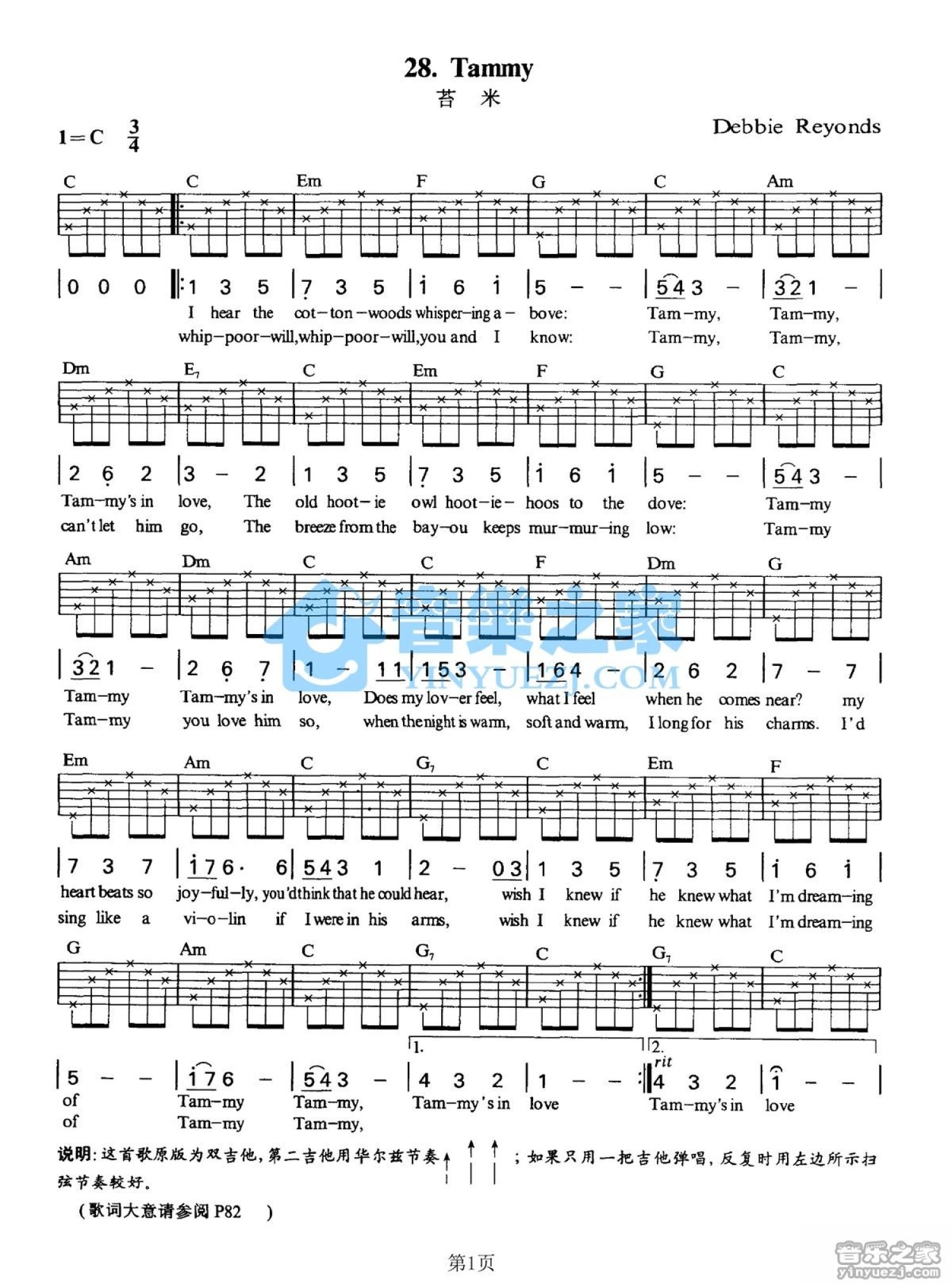 曲谱介绍: C调版DebbieReynolds《Tammy》吉他弹唱六线谱