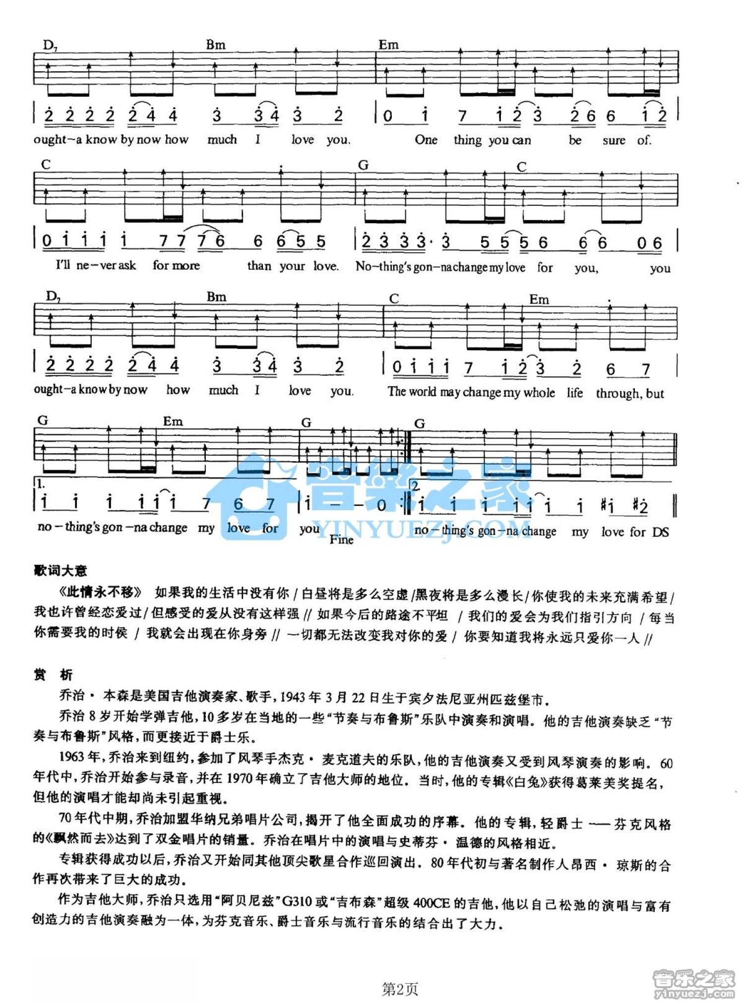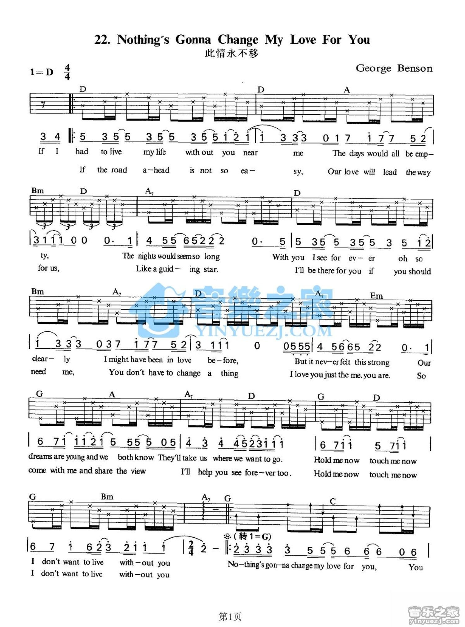 曲谱介绍: D调版 《Nothing's gonna change my love for you》吉他六线谱