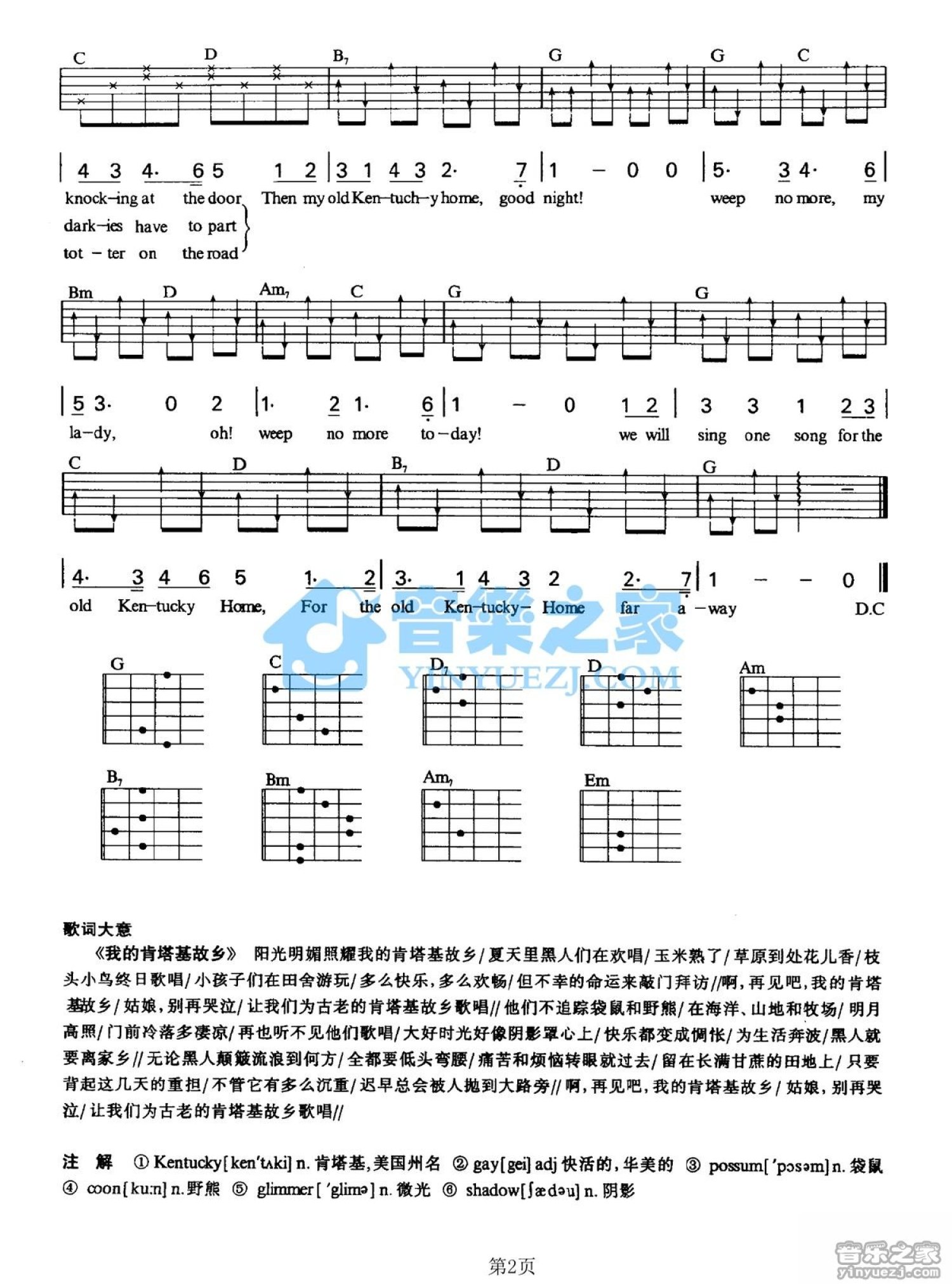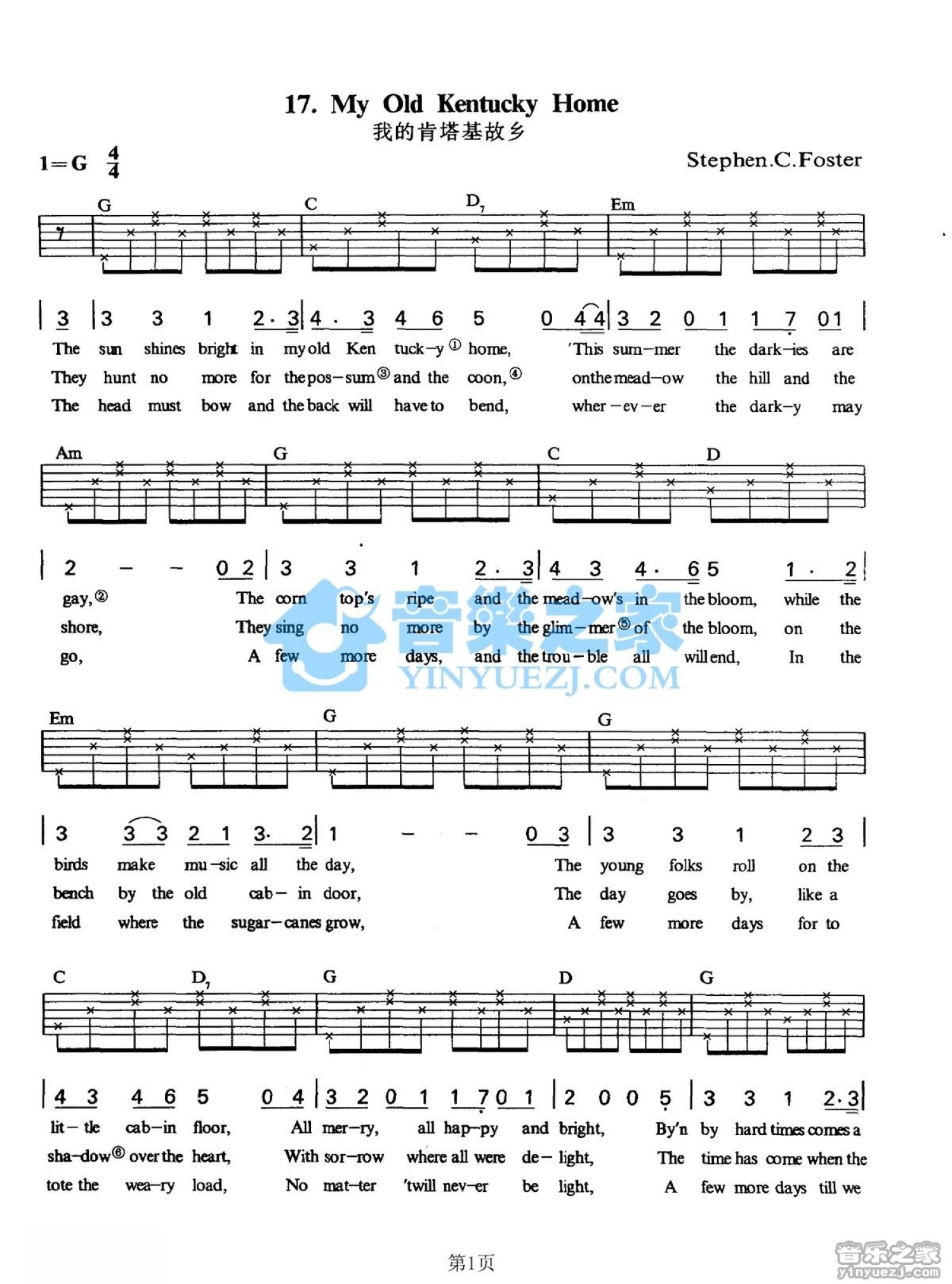 曲谱介绍: G调版《MyOldKentuckyHome》吉他弹唱六线谱