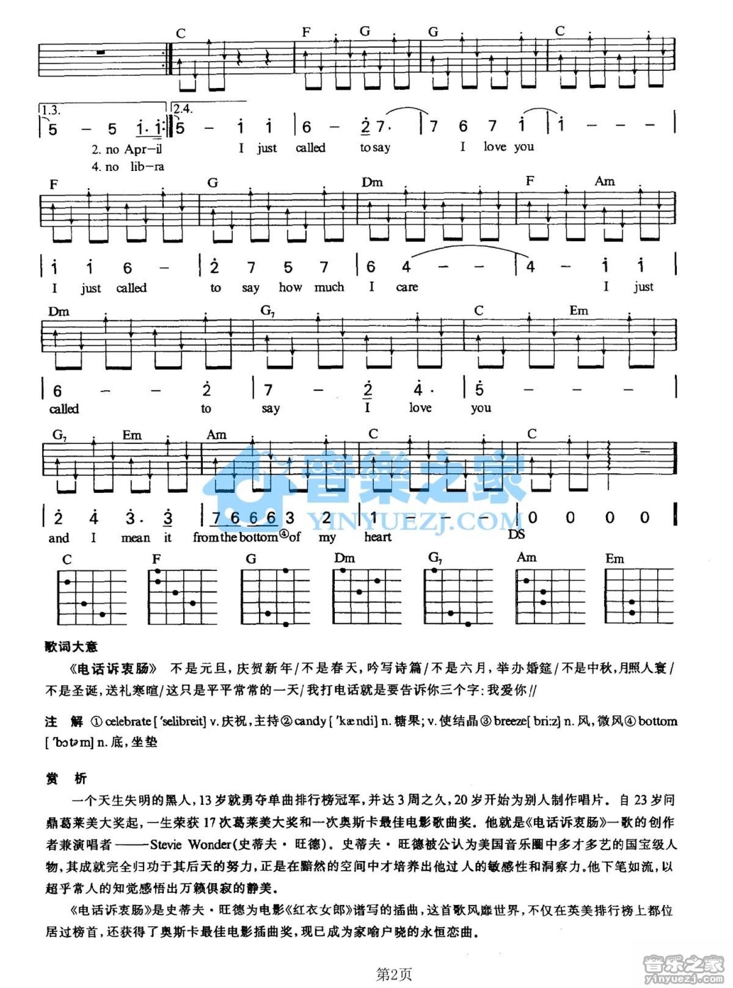 曲谱介绍: C调版 《i just called to say i love you》吉他弹唱六线谱