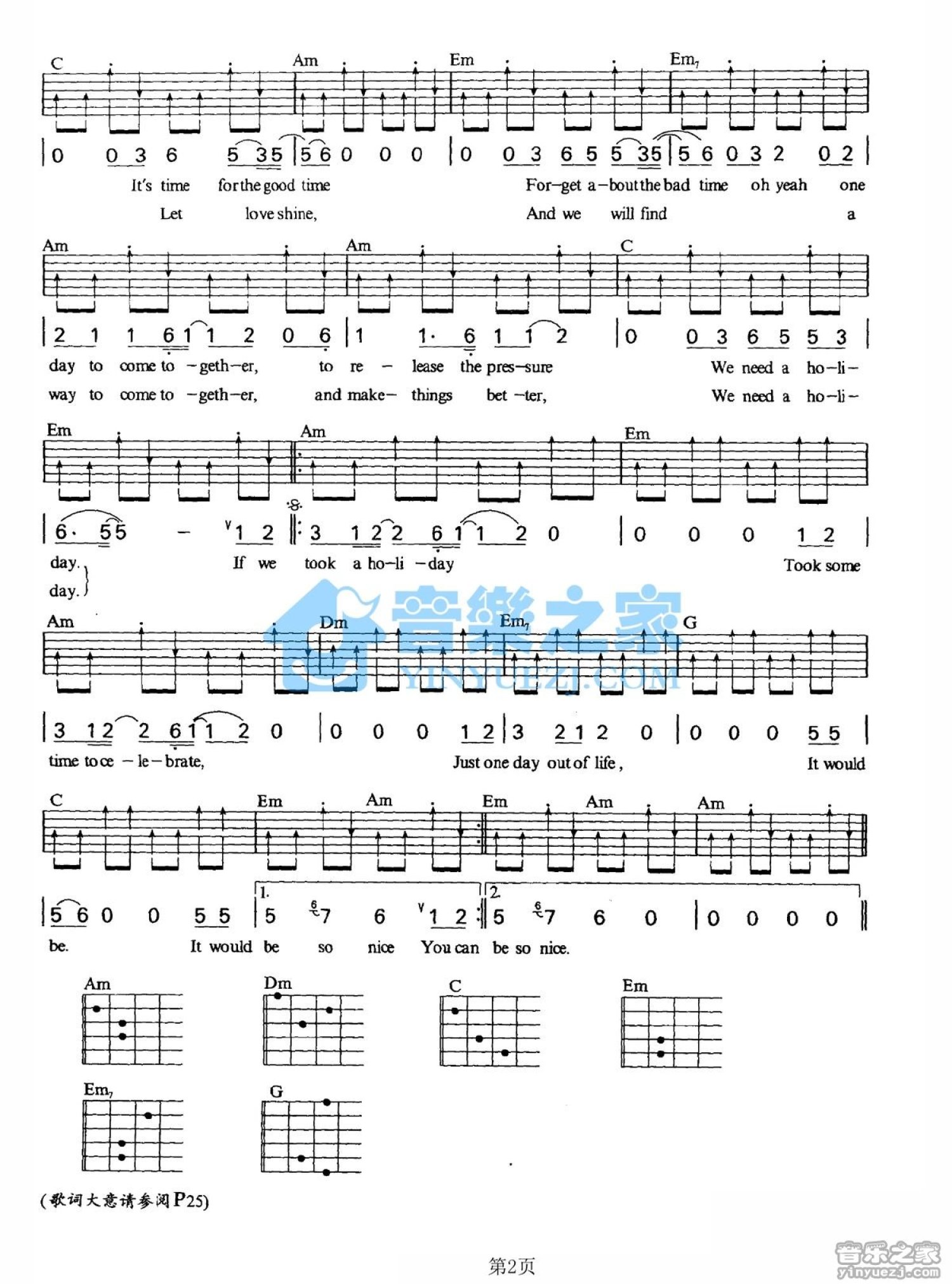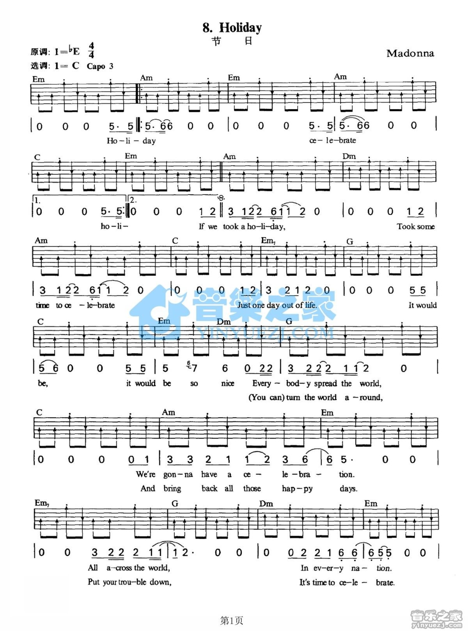 曲谱介绍: C调版Madonna《Holiday》吉他弹唱六线谱