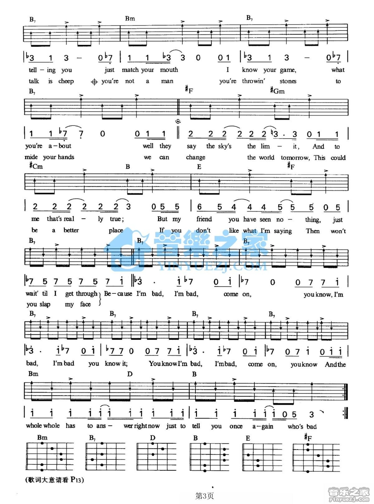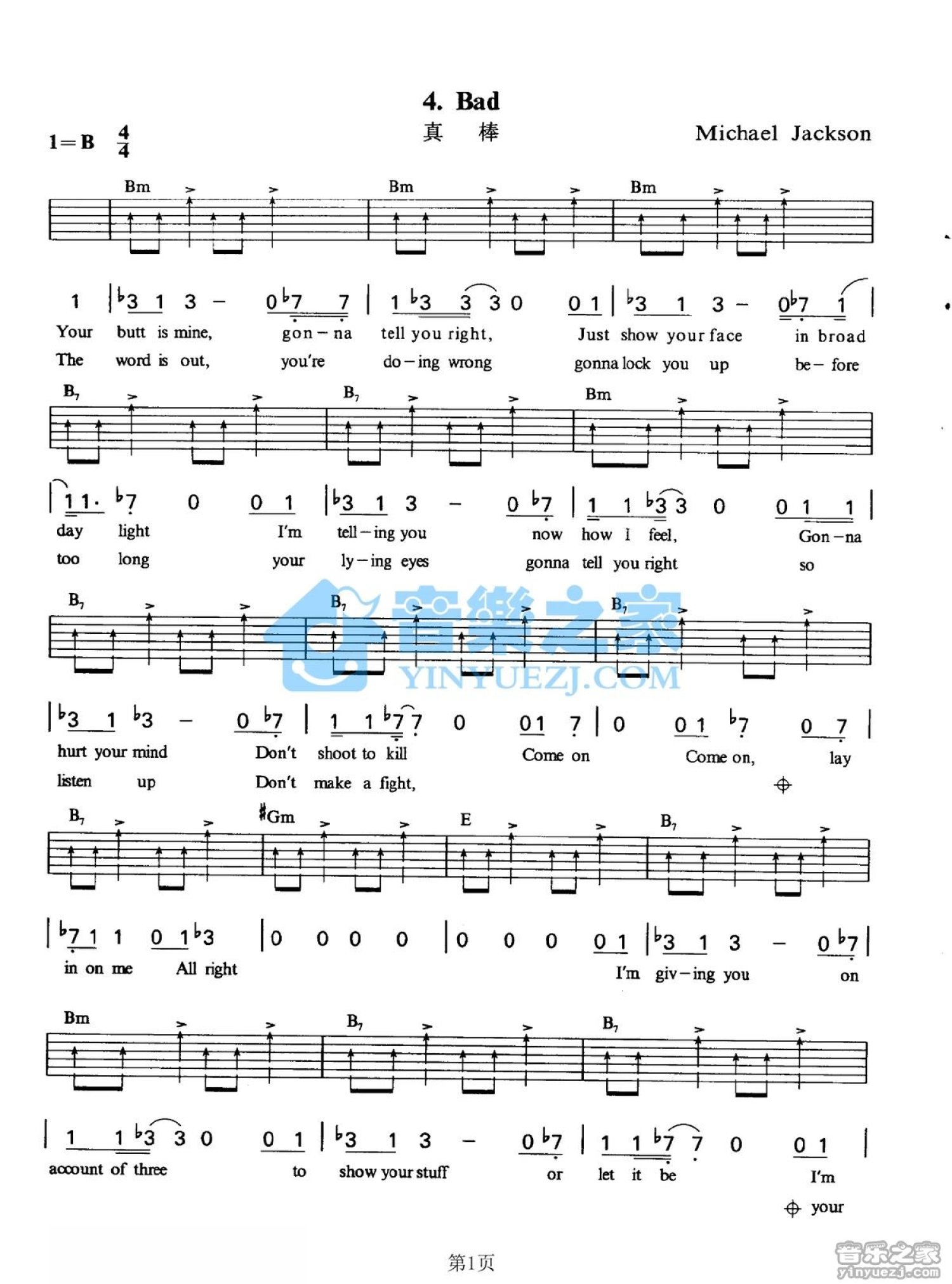 曲谱介绍: B调版MichaelJackson《Bad》吉他弹唱六线谱