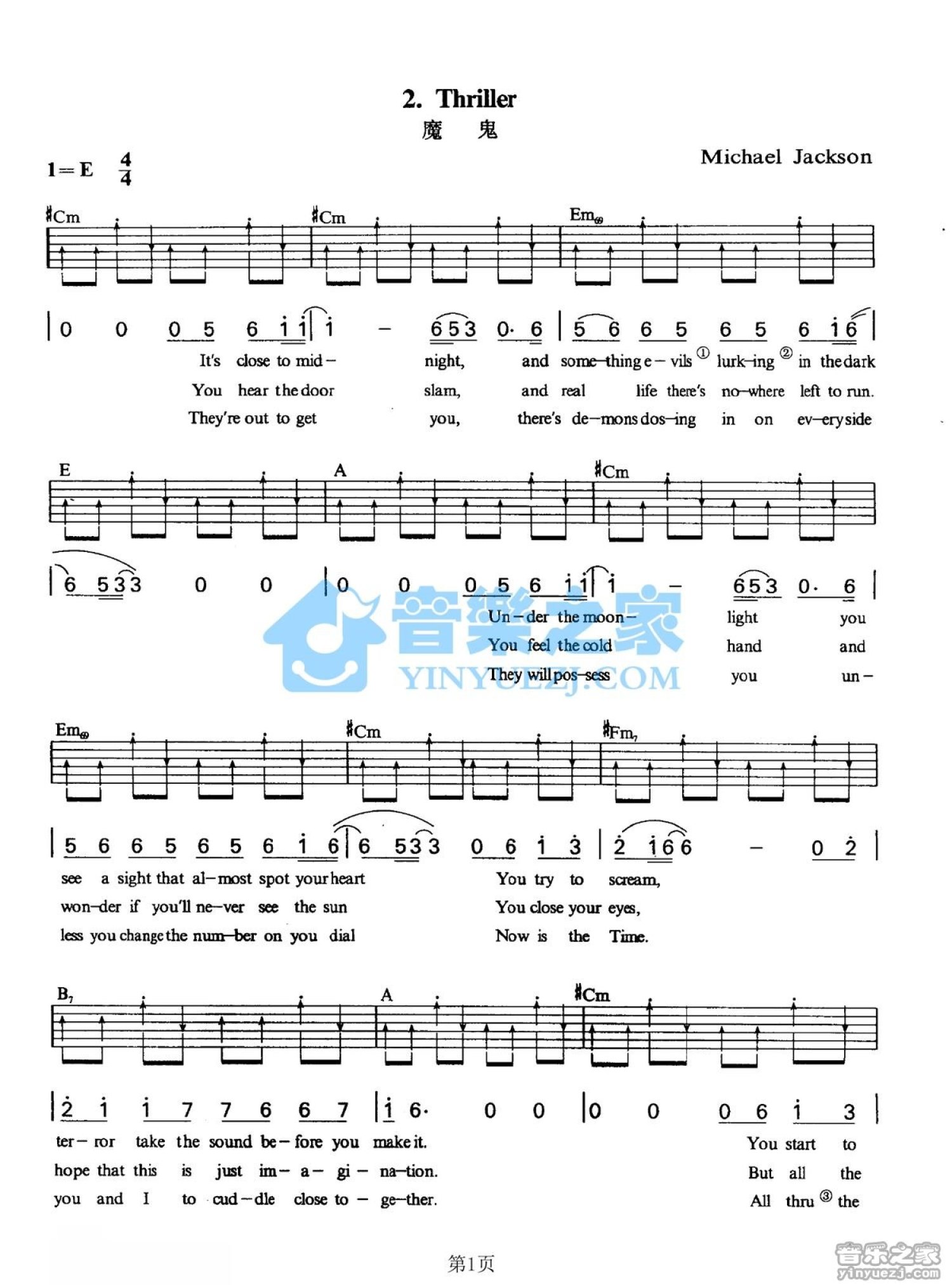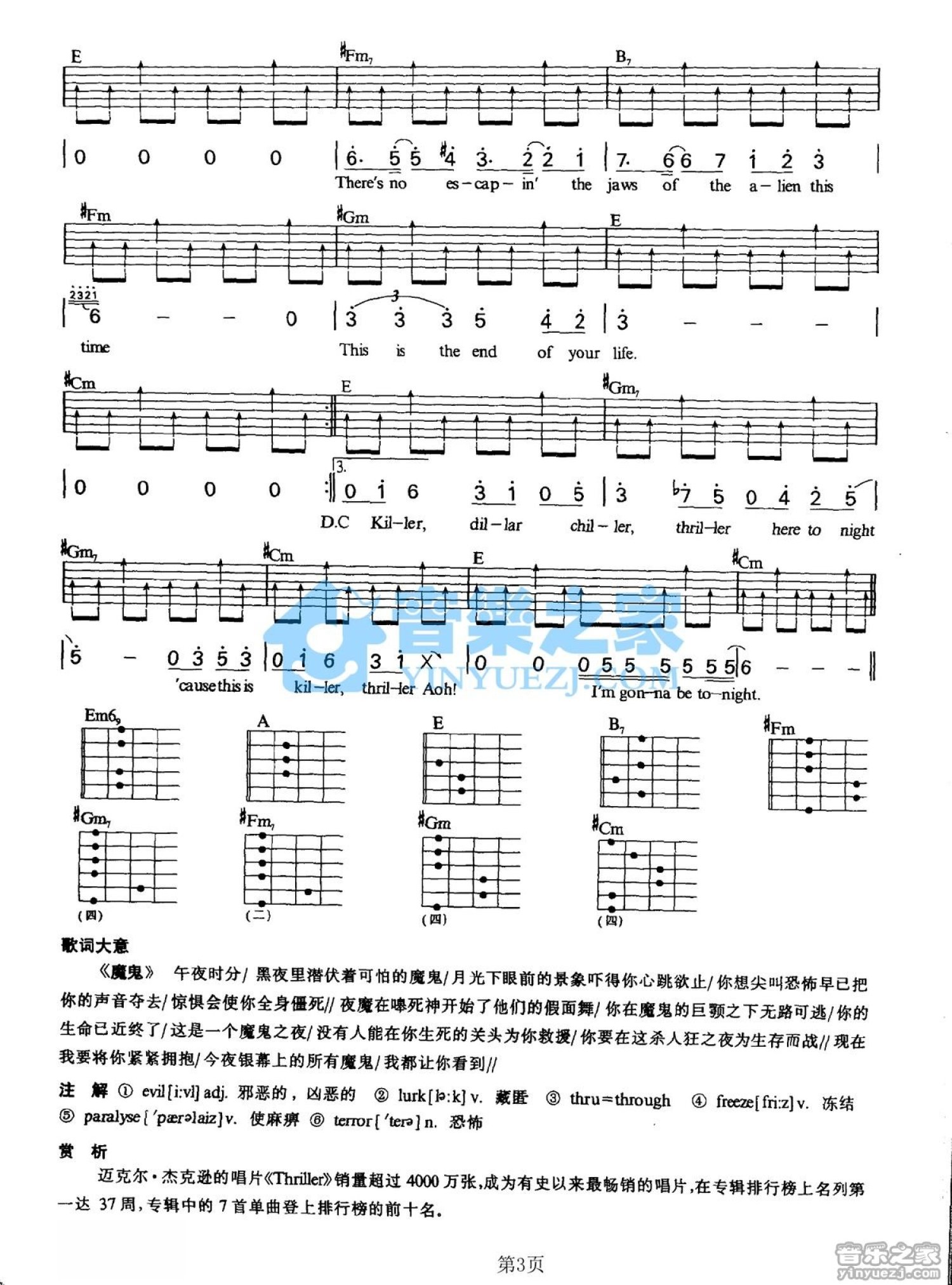 曲谱介绍: E调版MichaelJackson《Thriller》吉他弹唱六线谱