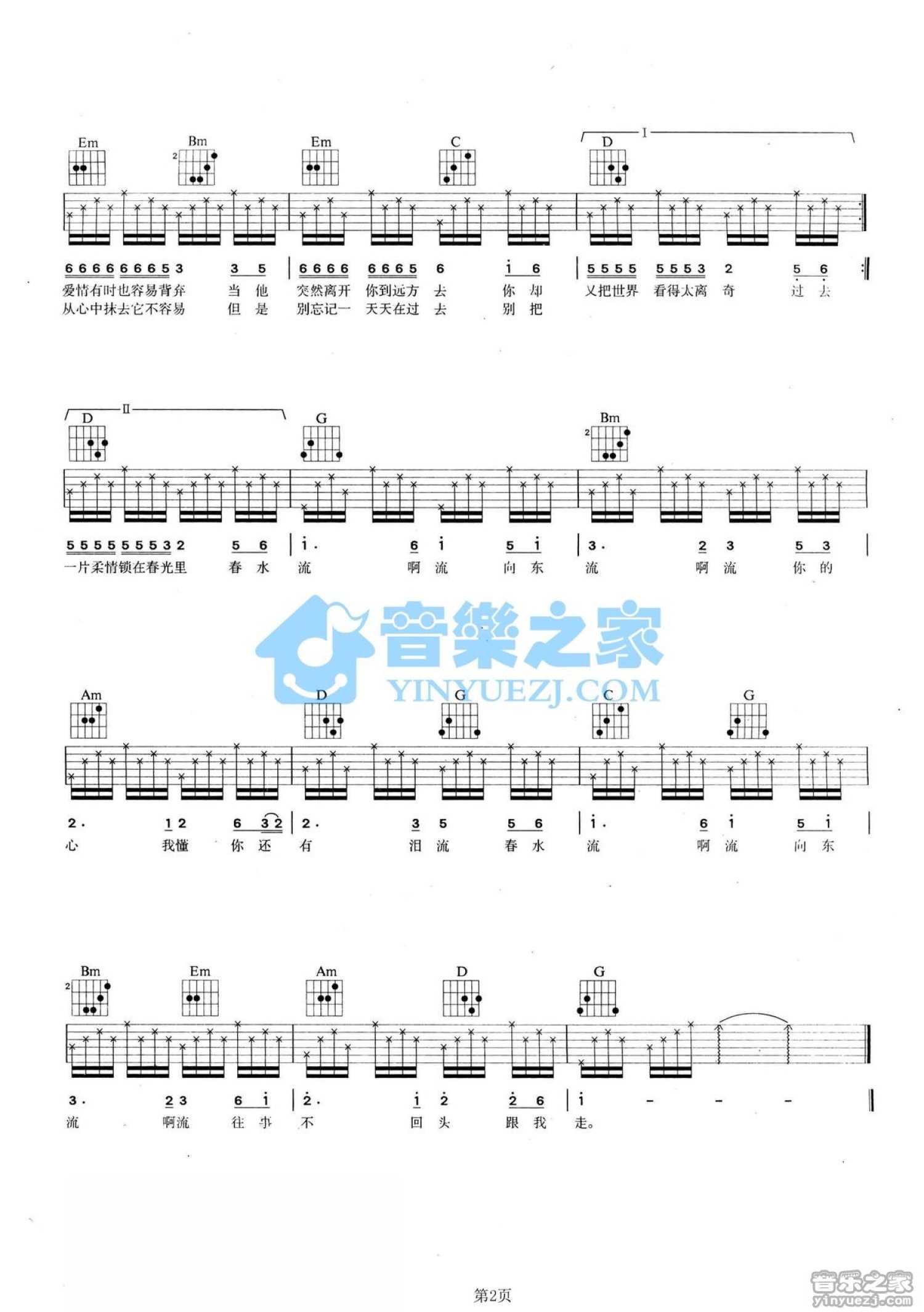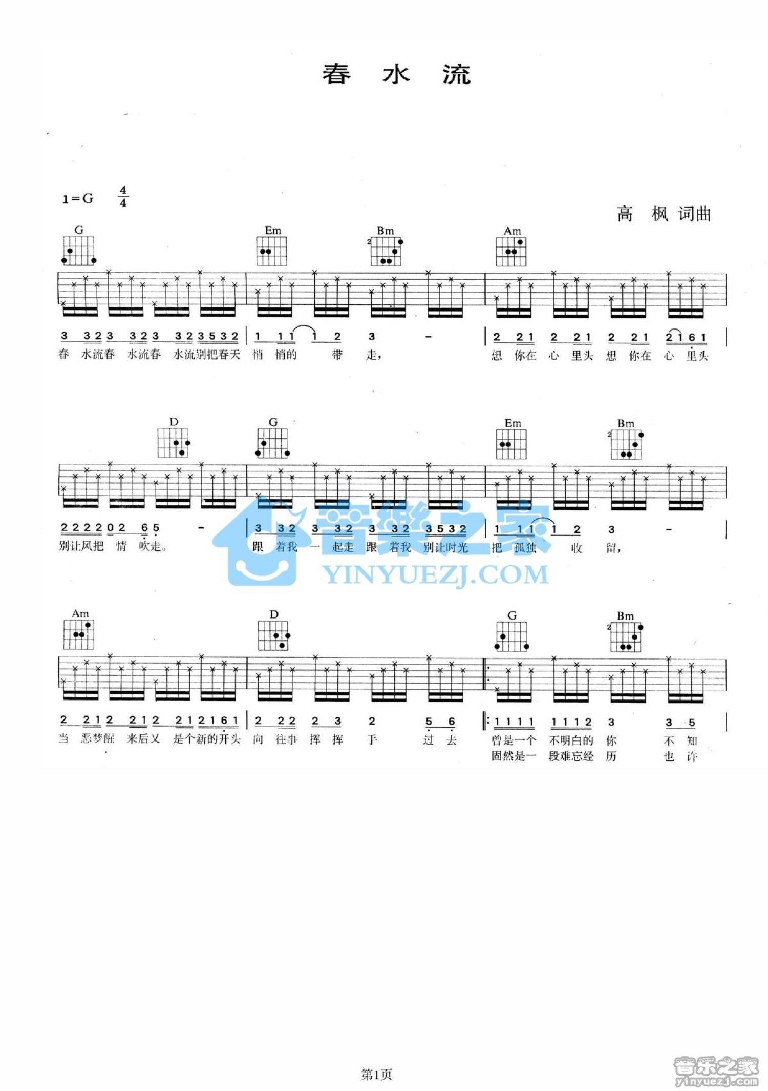 曲谱介绍: G调版黄格选《春水流》吉他弹唱六线谱
