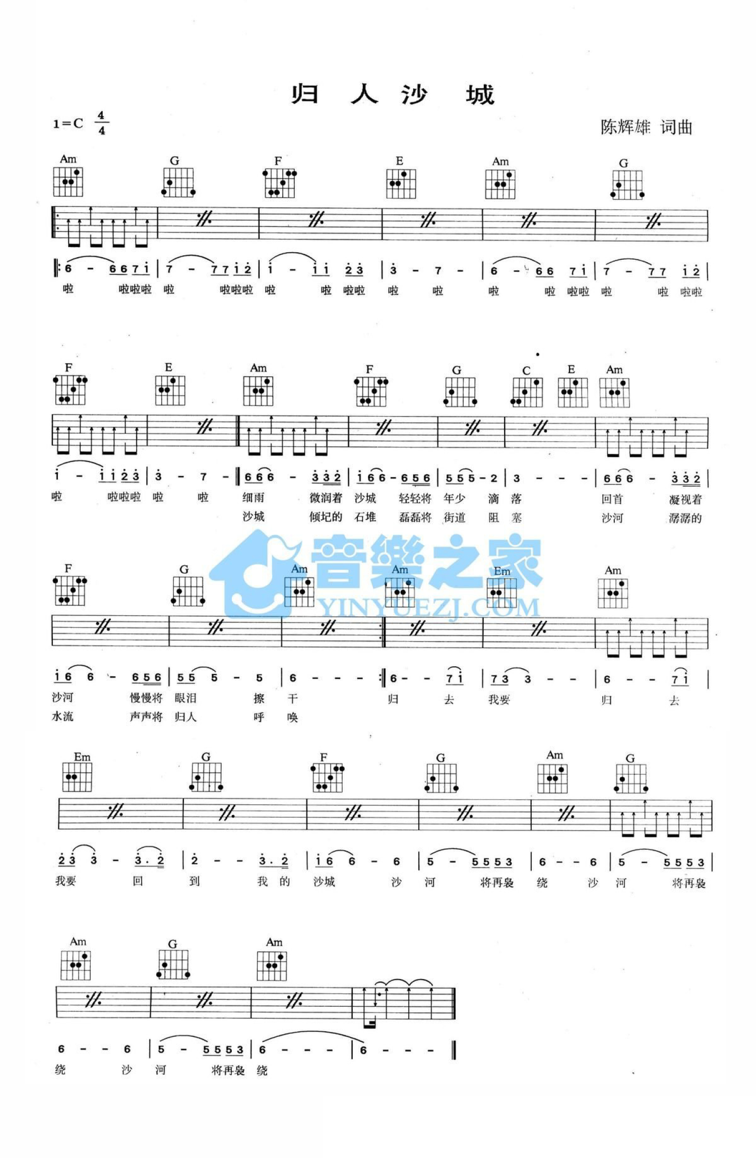 曲谱介绍: C调版施孝荣《归人沙城》吉他弹唱六线谱