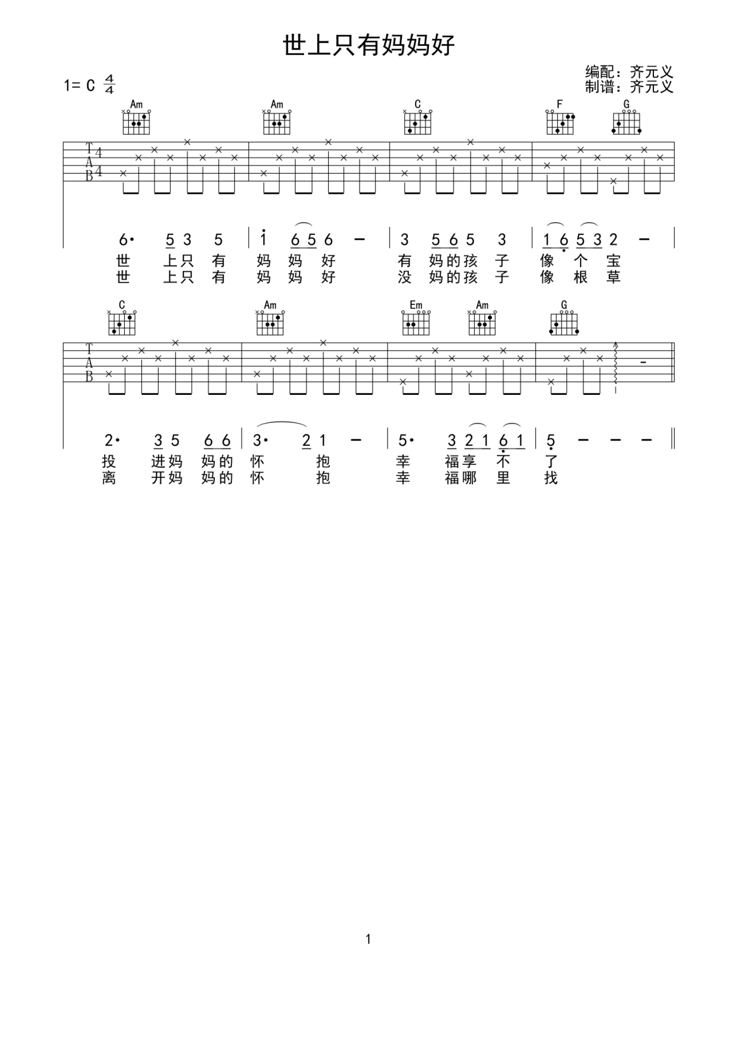 曲谱介绍: C调版《世上只有妈妈好》吉他弹唱六线谱