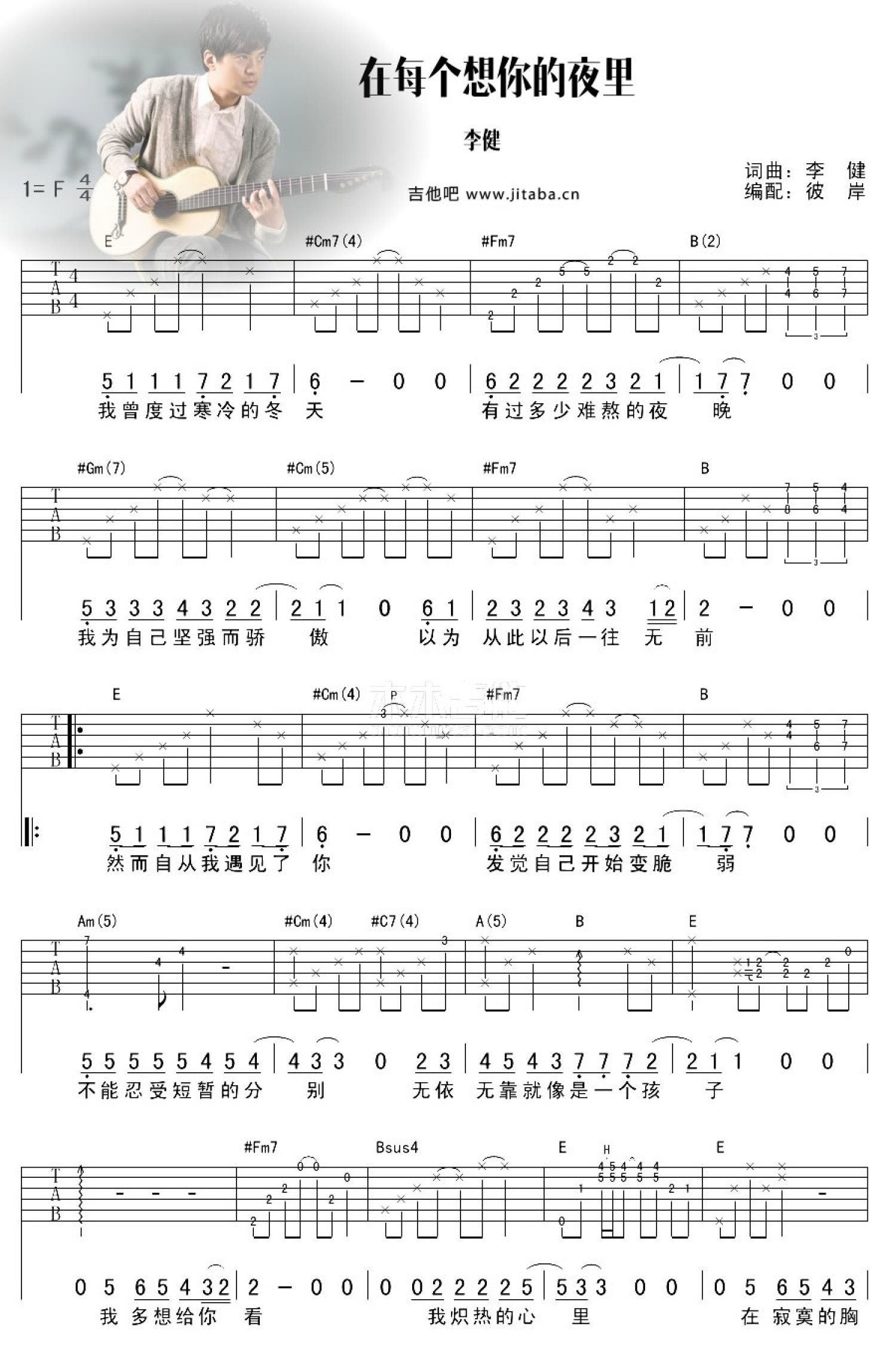 在每个想你的夜里吉他谱 - 李健 - F调吉他弹唱谱