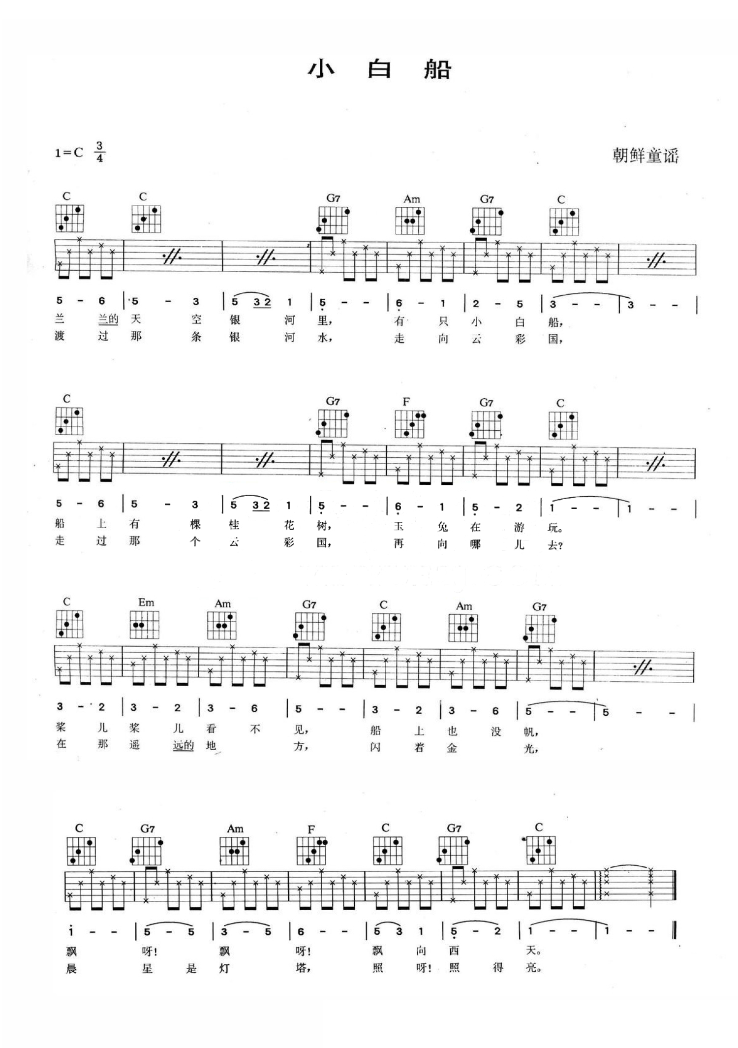 小白船吉他谱 - 朝鲜童谣 - C调吉他弹唱谱
