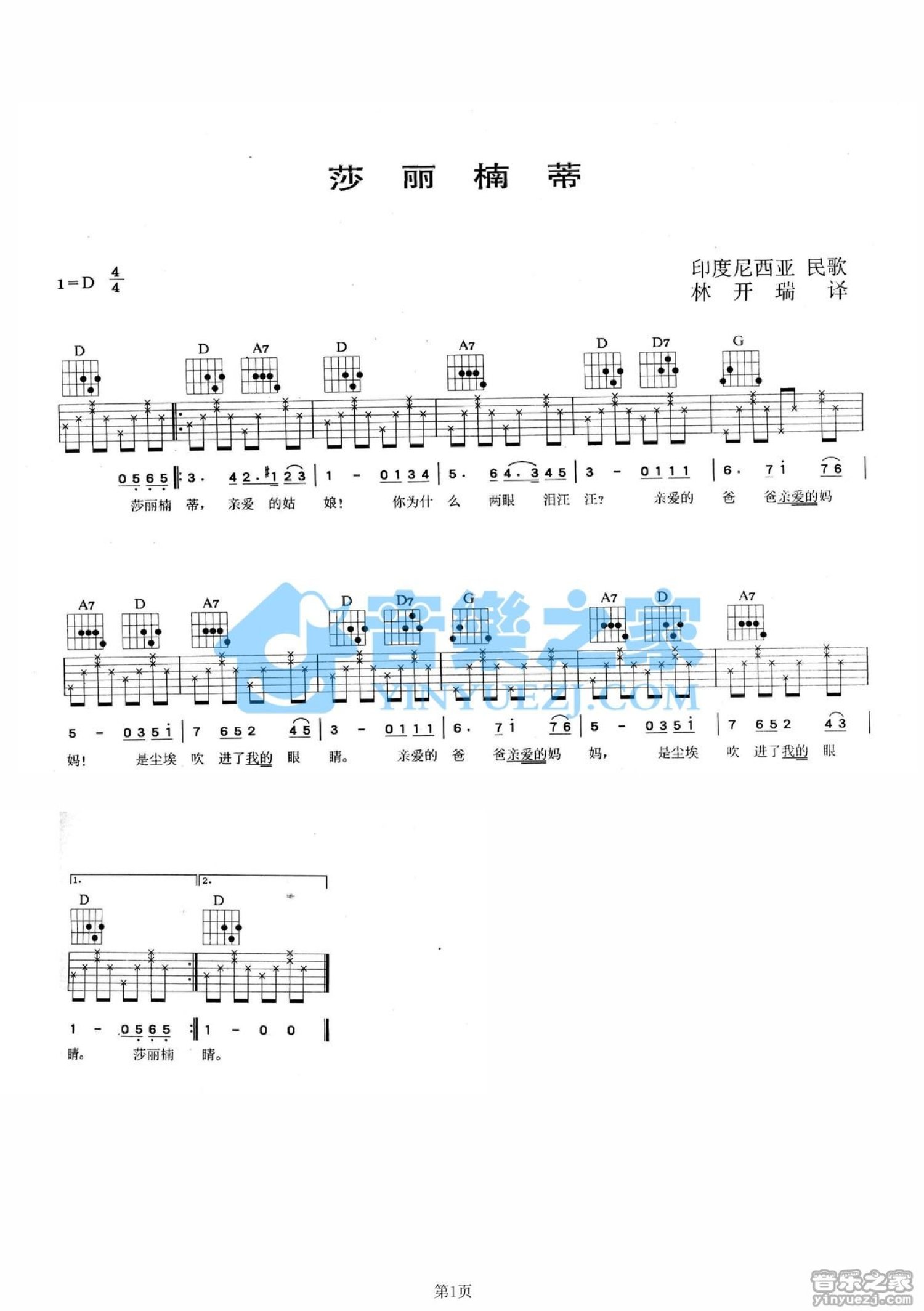 曲谱介绍: D调版印度尼西亚民歌《莎丽楠蒂》吉他弹唱六线谱
