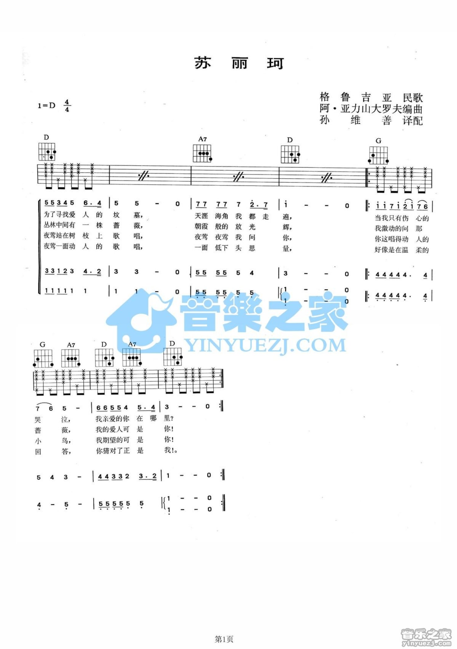 曲谱介绍: D调版格鲁吉亚民歌《苏丽河》吉他弹唱六线谱