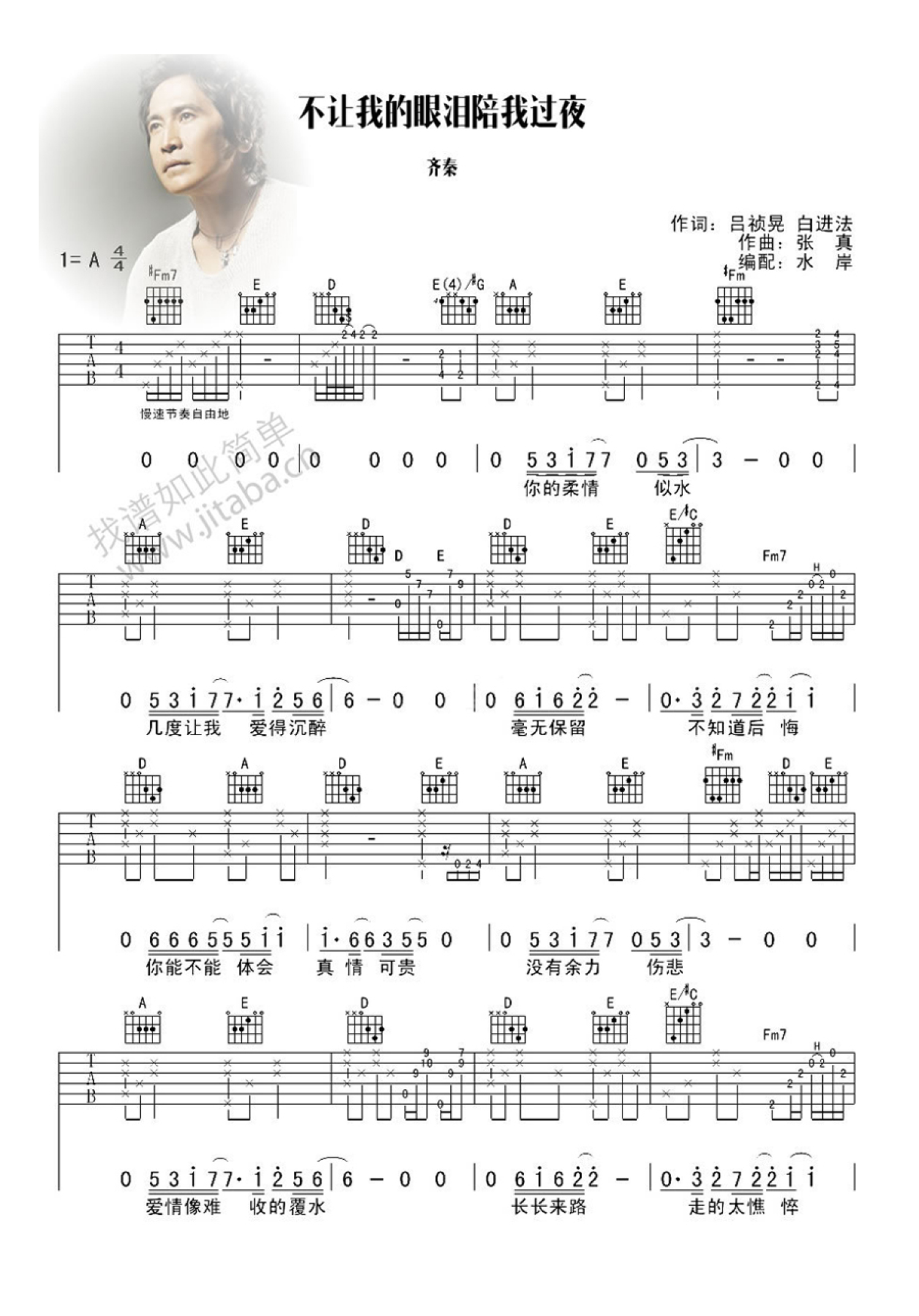 不让我的眼泪陪我过夜吉他谱 - 齐秦 - A调吉他弹唱谱