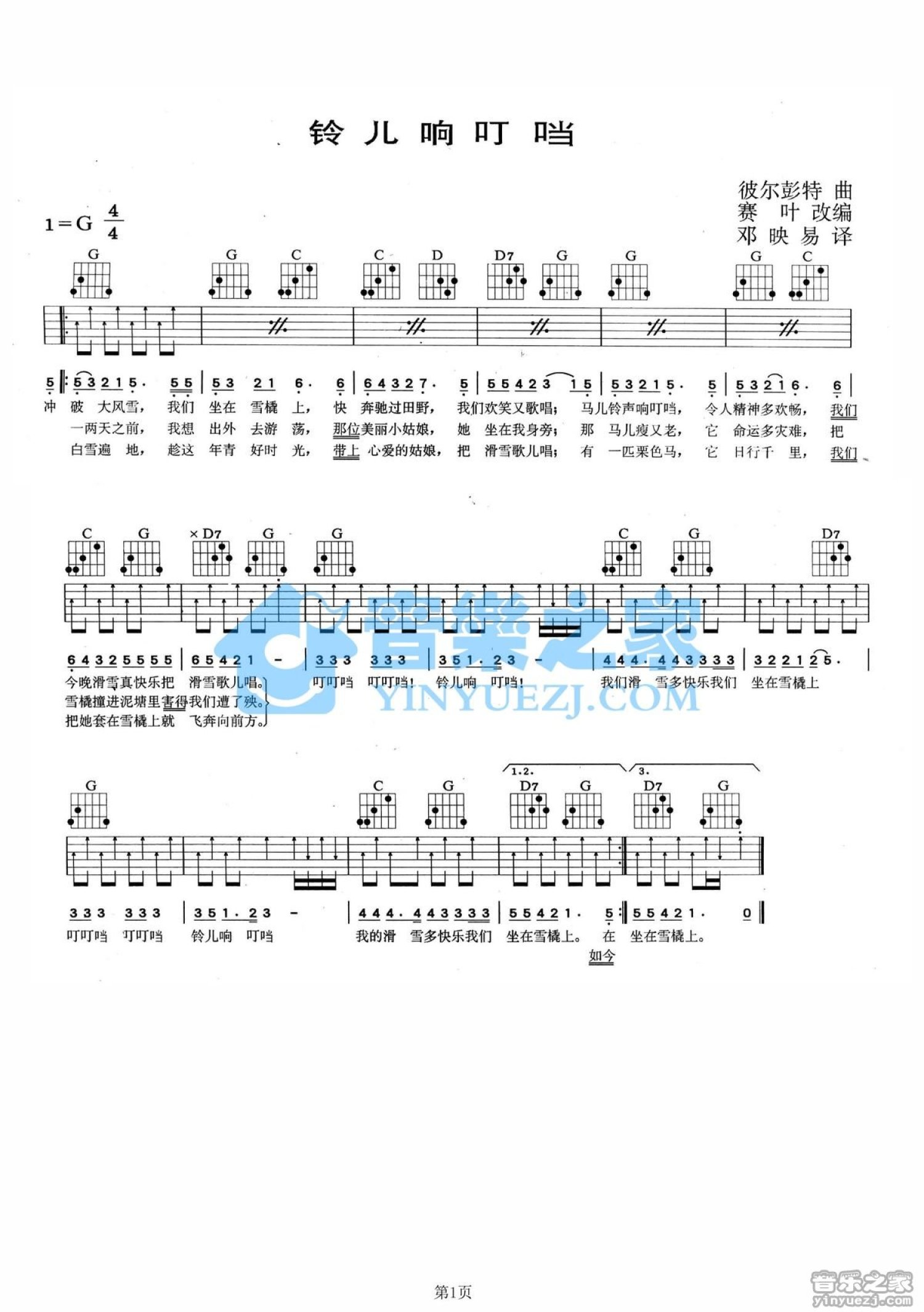 曲谱介绍: G调版《铃儿响叮当》吉他弹唱六线谱