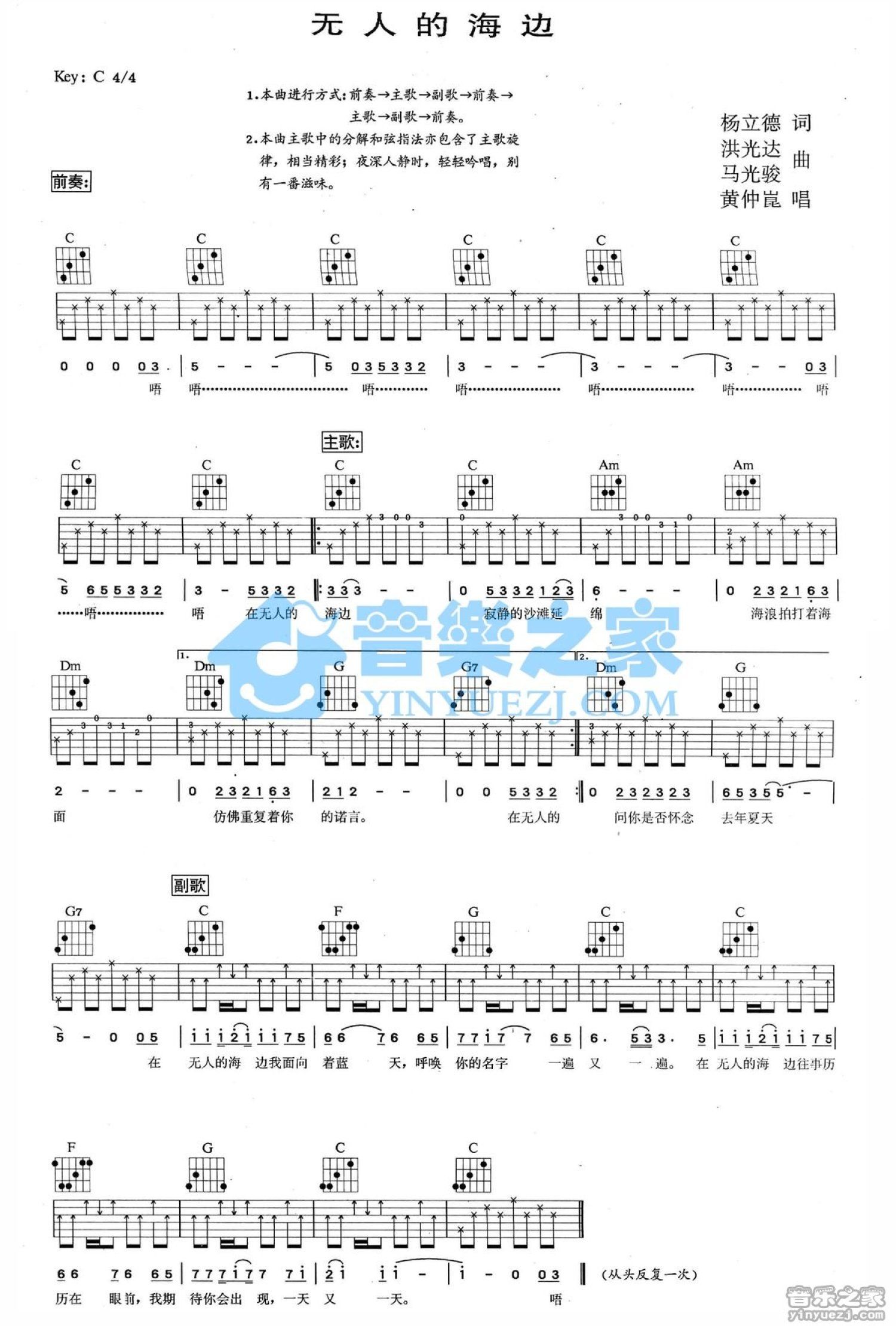 曲谱介绍: C调版黄仲昆《无人的海边》吉他弹唱六线谱