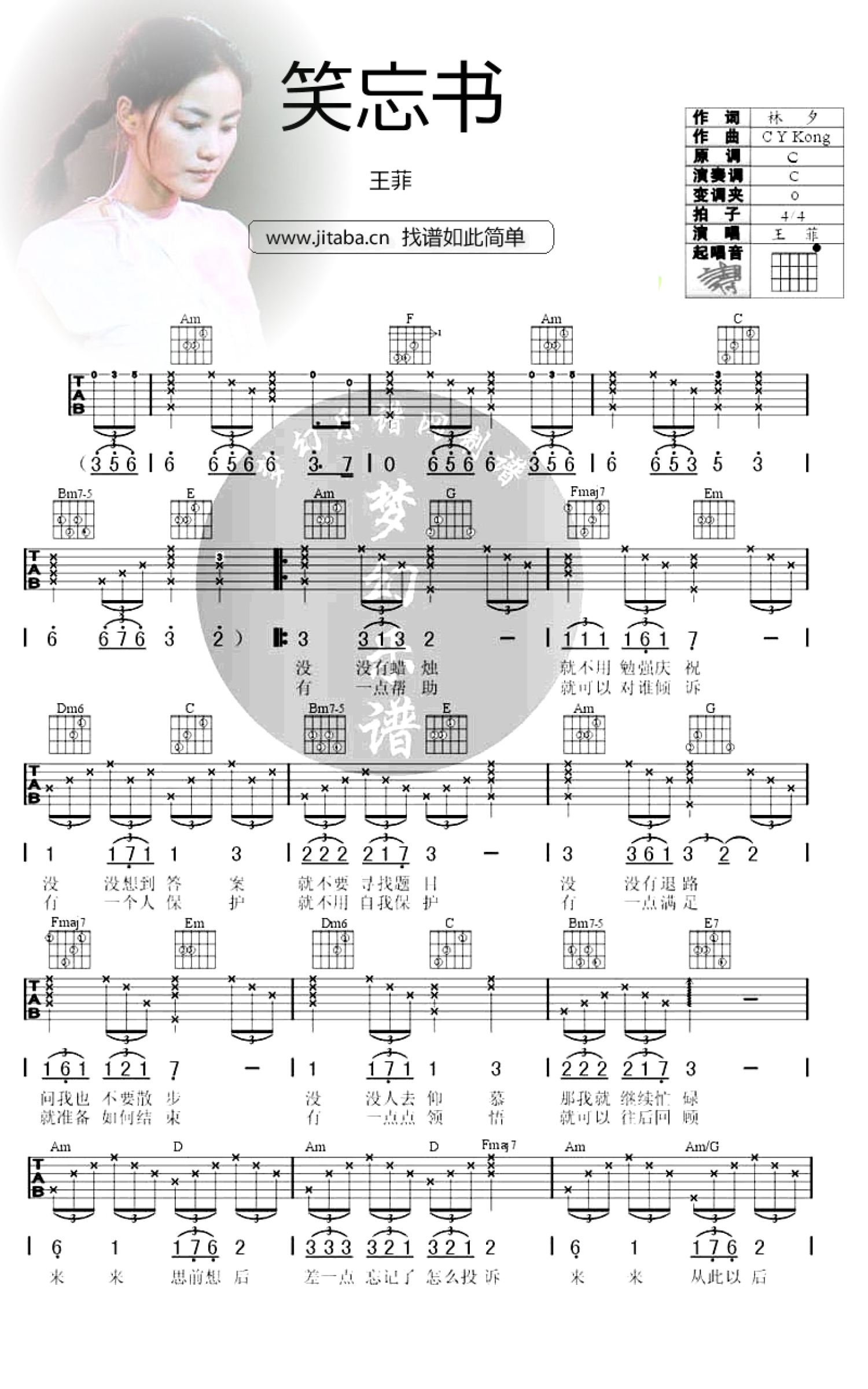 笑忘书吉他谱 - 王菲 - C调吉他弹唱谱
