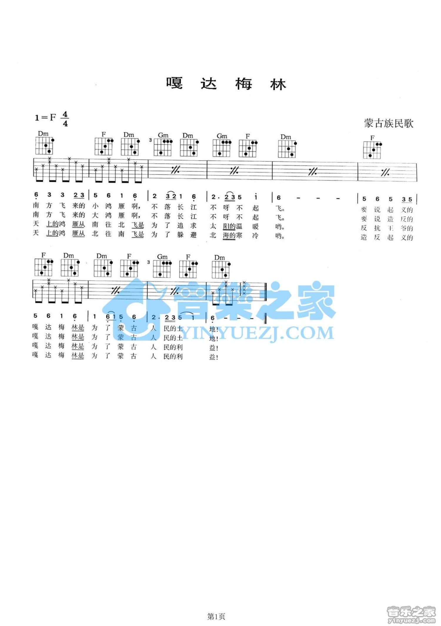 曲谱介绍: F调版蒙古族民歌《嘎达梅林》吉他弹唱六线谱