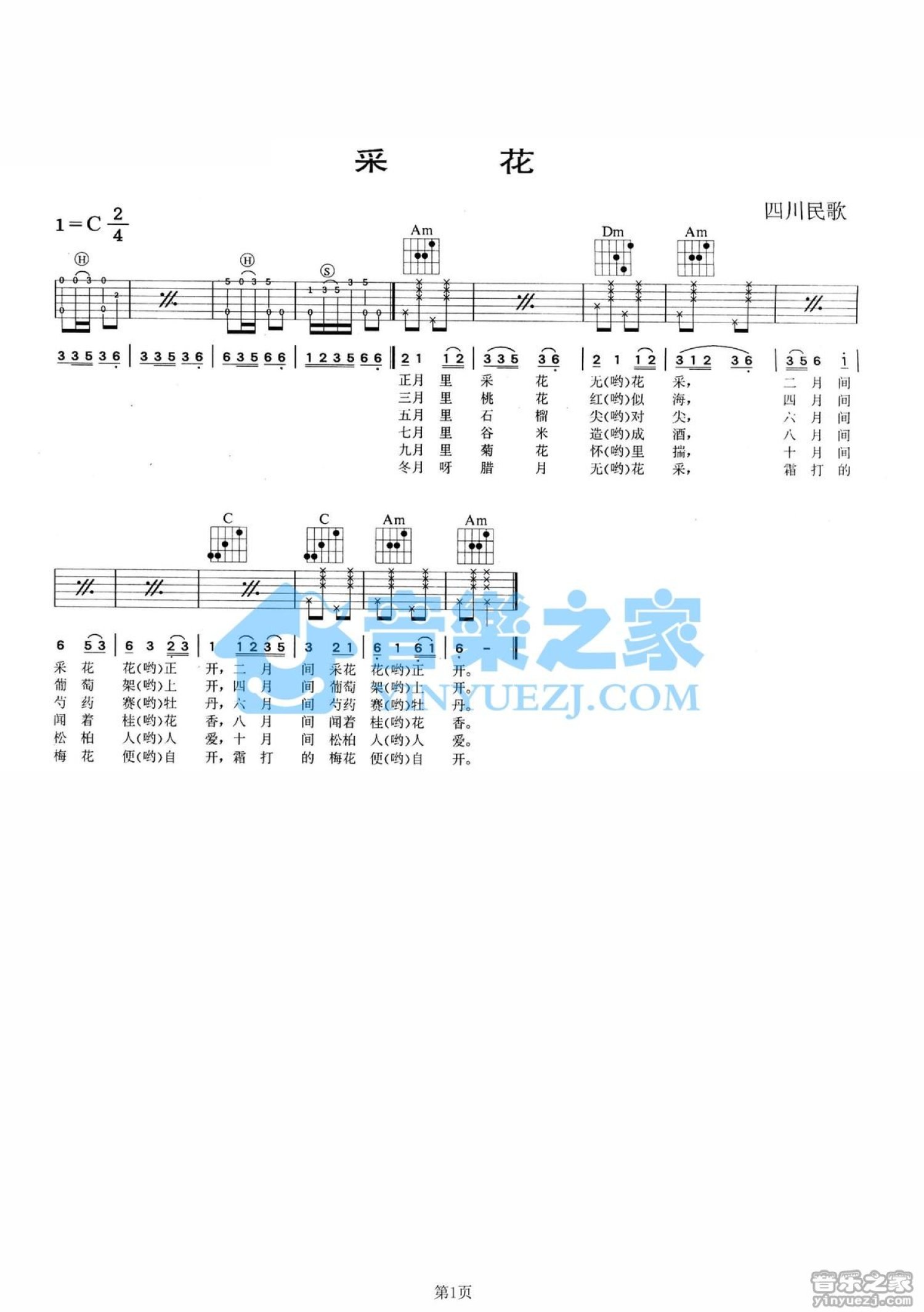 曲谱介绍: C调版经典民歌《采花》吉他弹唱六线谱