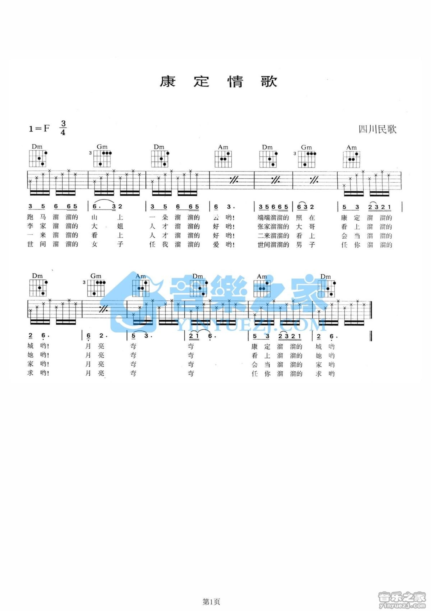 曲谱介绍: F调版《康定情歌》吉他弹唱六线谱