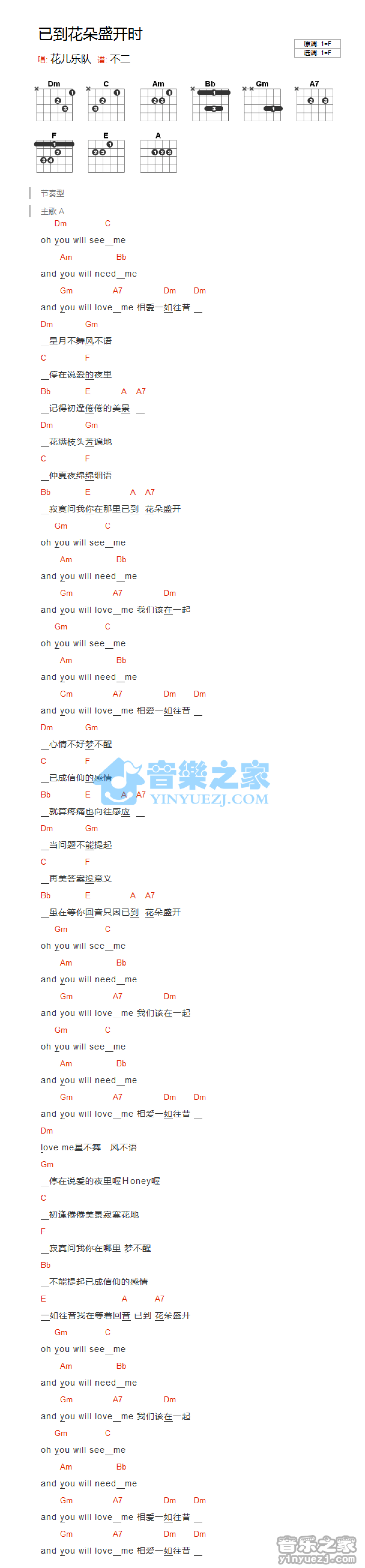 曲谱介绍: F调版 花儿乐队《已到花朵盛开时》吉他和弦弹唱谱