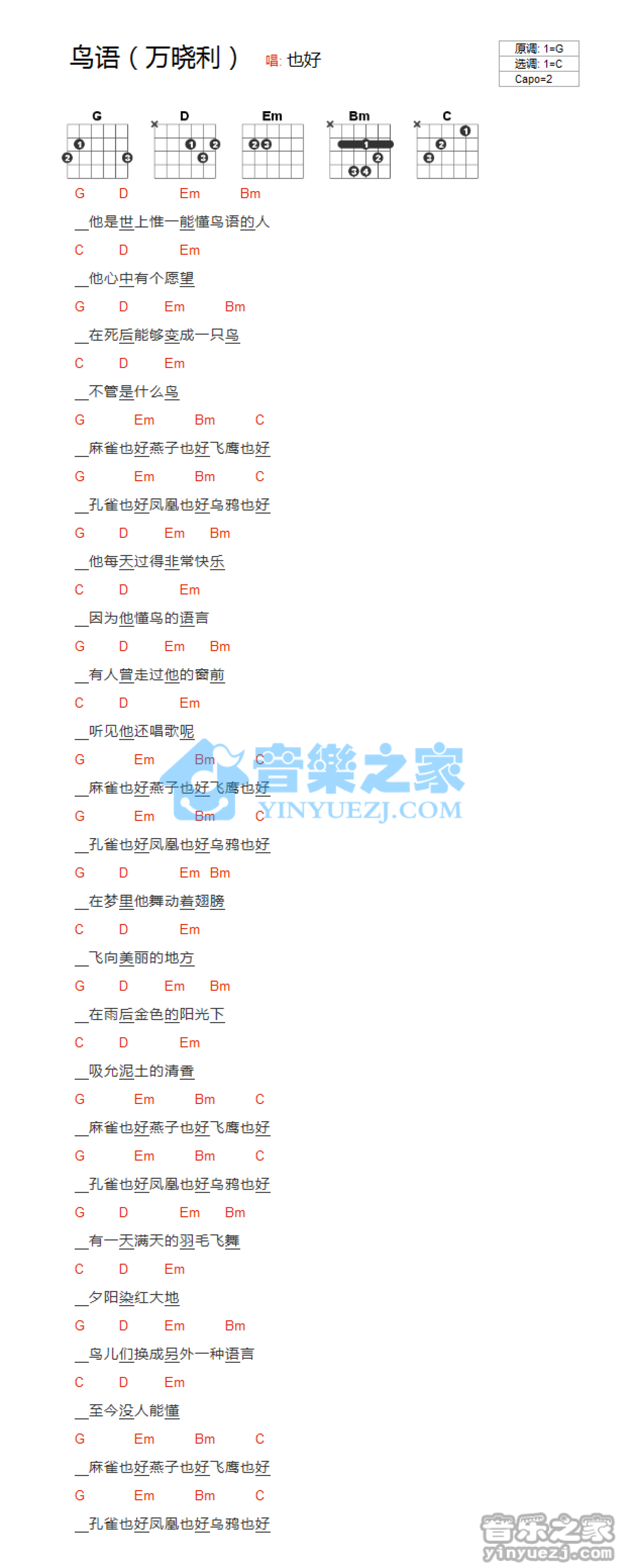 曲谱介绍: C调版万晓利《鸟语》吉他和弦弹唱谱