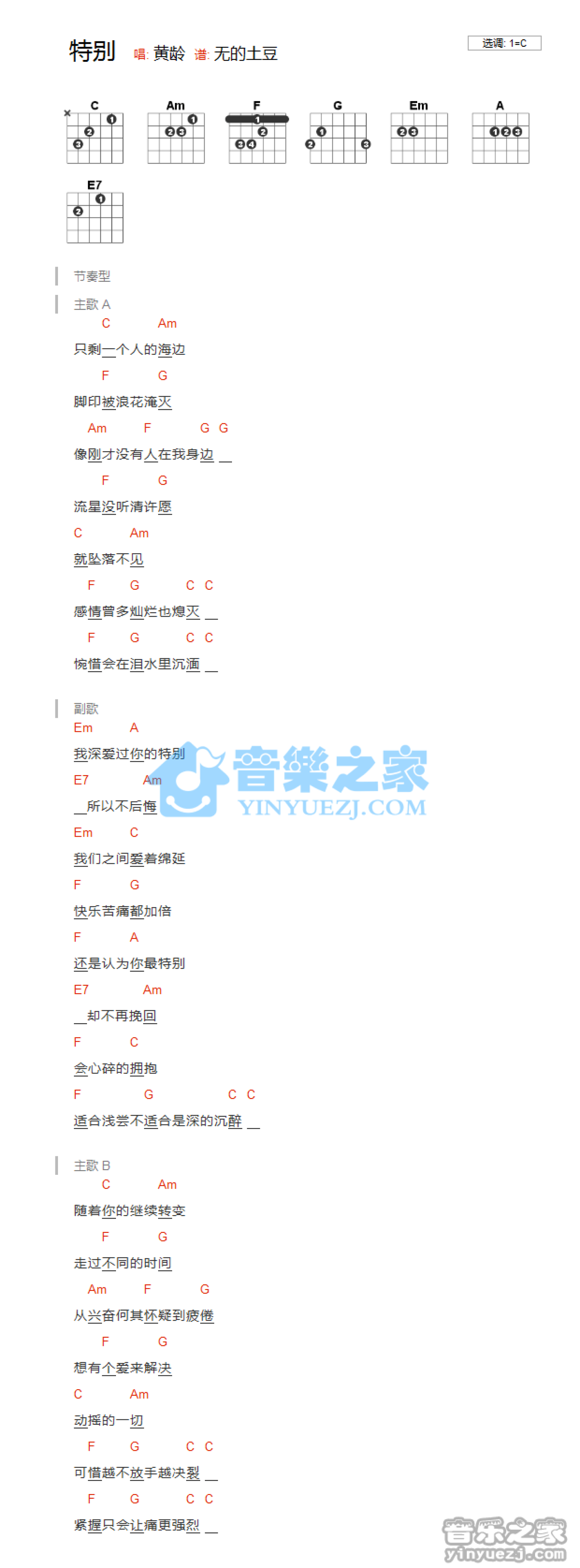 特别吉他谱 - 黄龄 - C调吉他弹唱谱 - 和弦谱