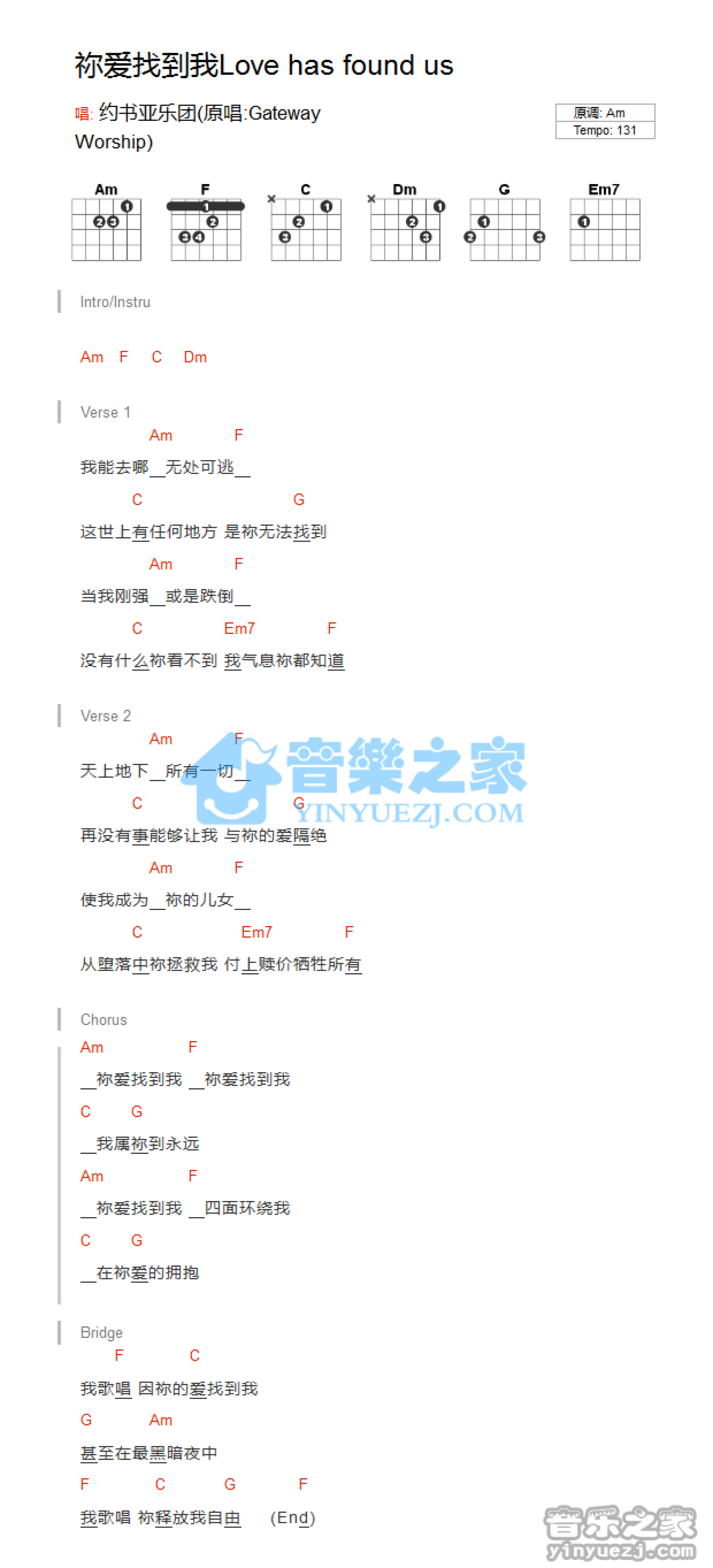 曲谱介绍: Am调版约书亚《你爱找到我》吉他和弦弹唱谱