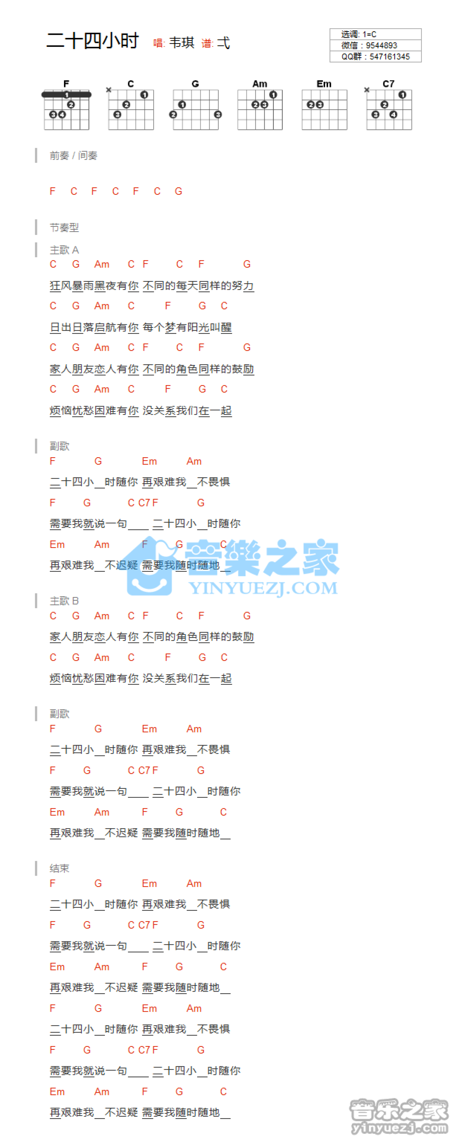 曲谱介绍: C调版韦琪《二十四小时》吉他和弦弹唱谱