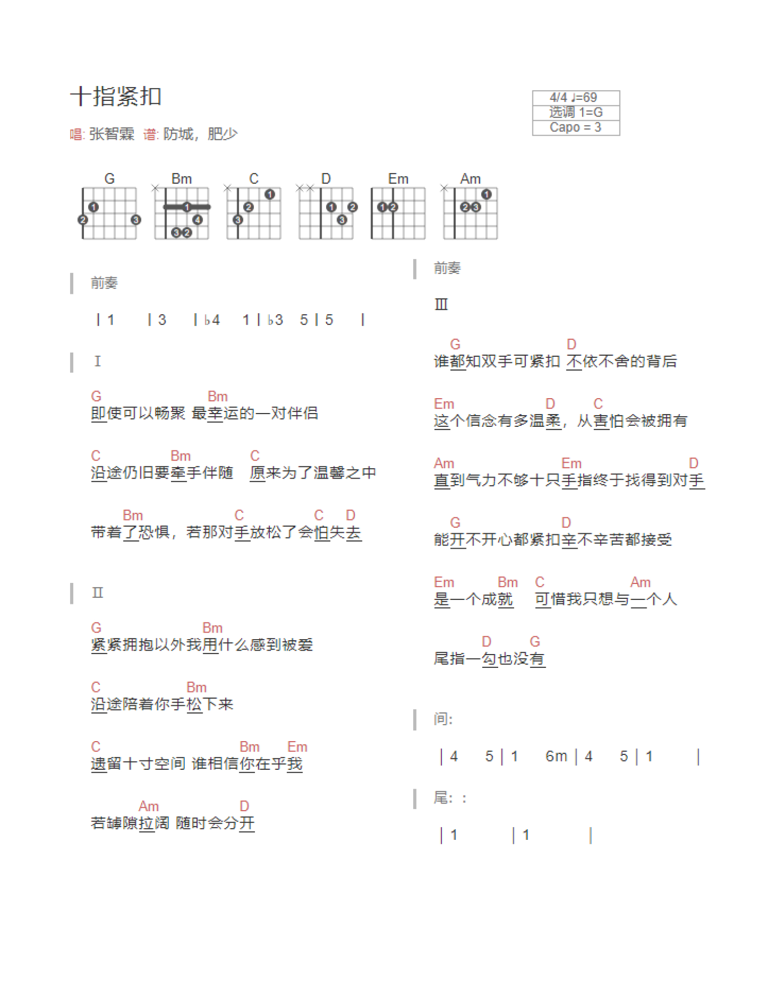 曲谱介绍: G调版张智霖《十指紧扣》吉他和弦弹唱谱