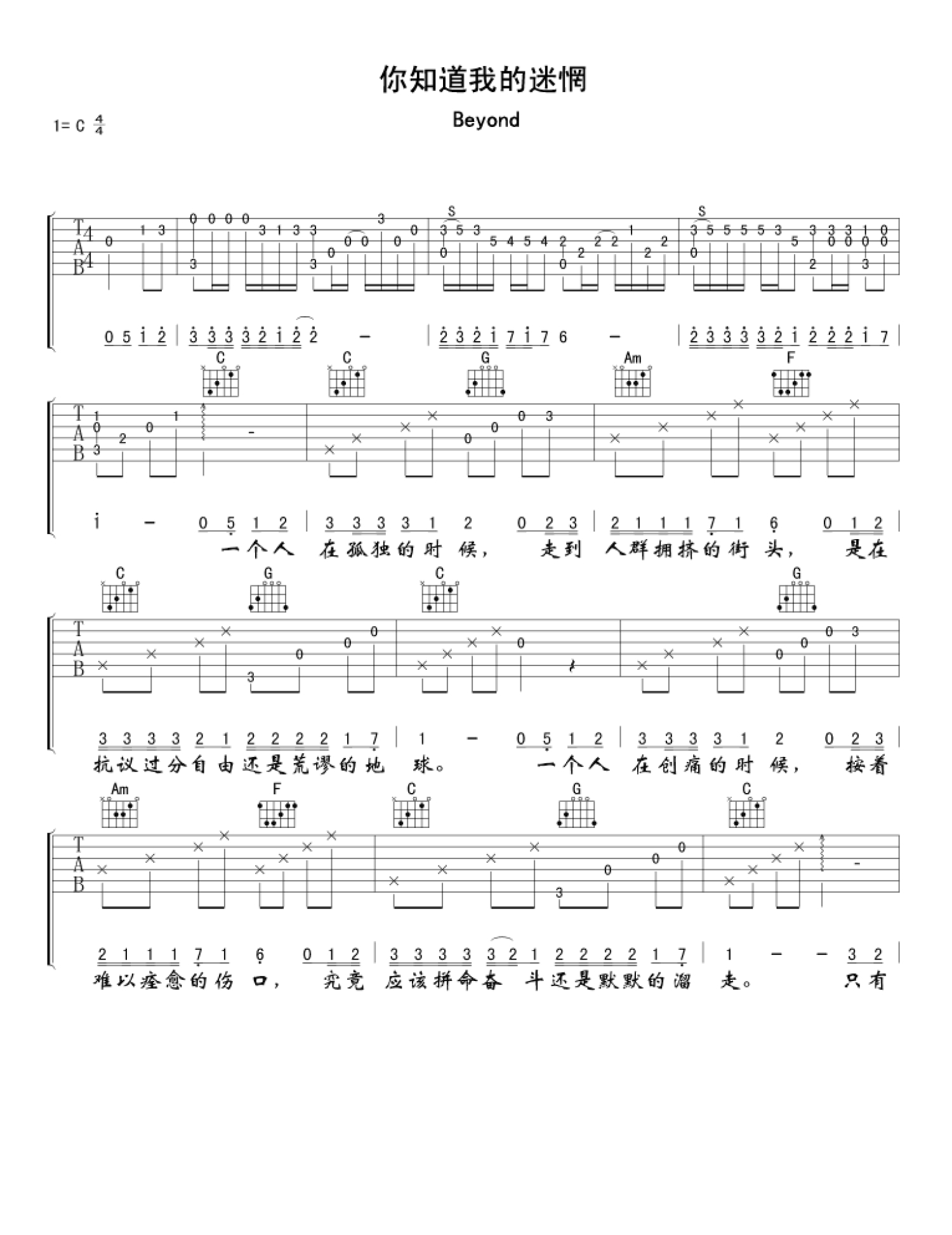 你知道我的迷惘吉他谱 - Beyond - C调吉他弹唱谱 - 国语版