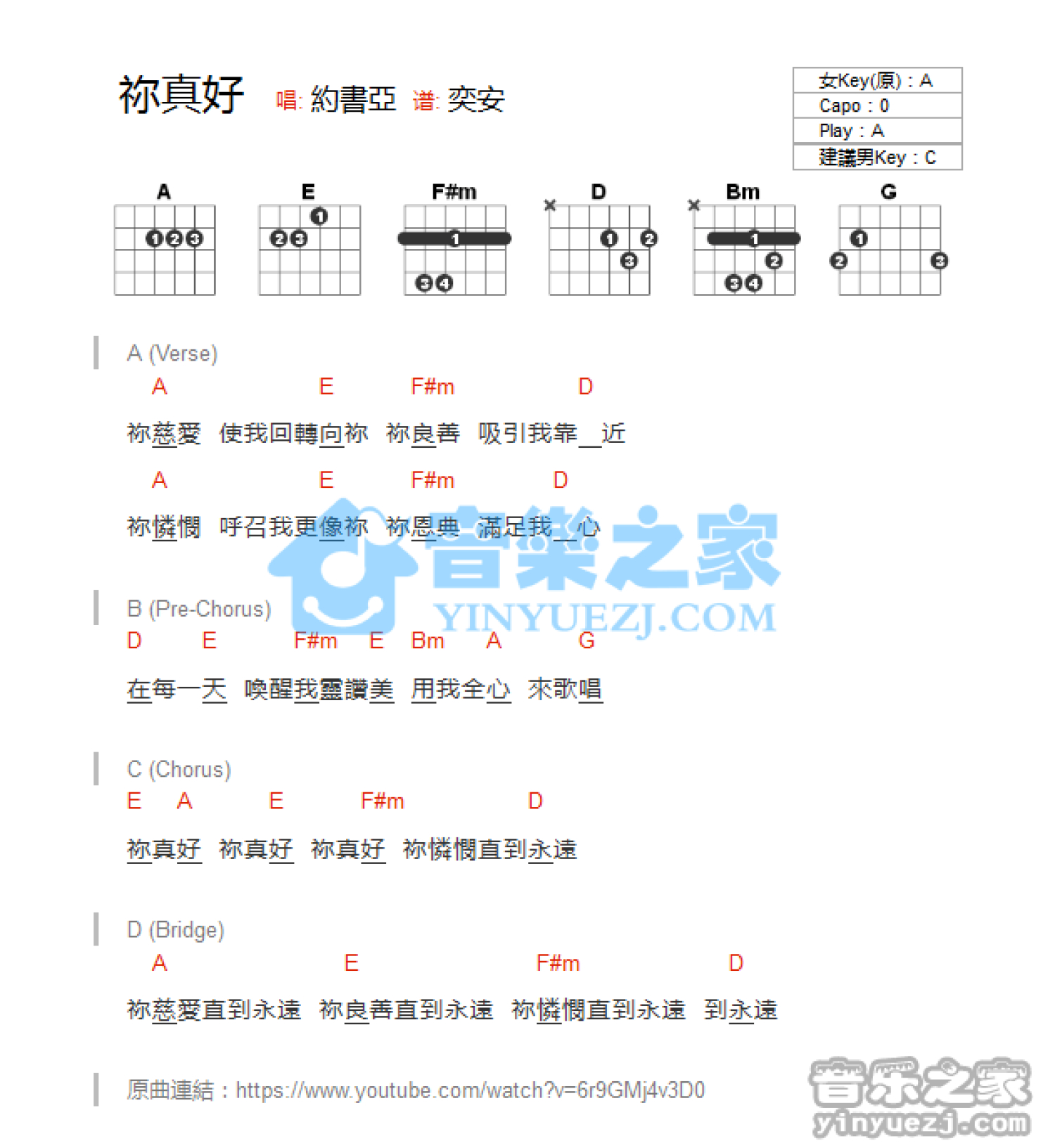 曲谱介绍: A调版约书亚《你真好》吉他和弦弹唱谱