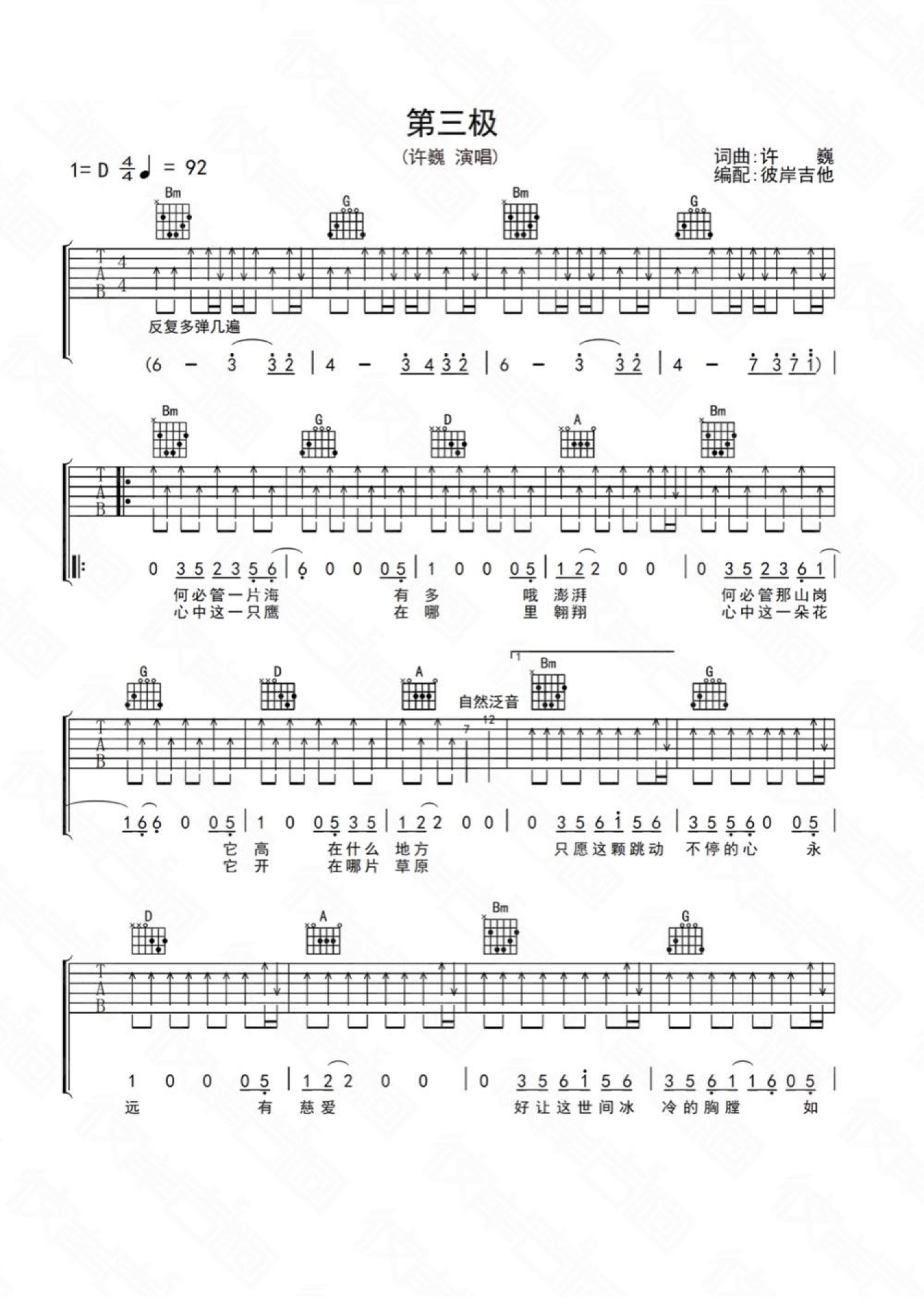 曲谱介绍: 许巍第三极吉他谱。这首歌曲是许巍为同名纪录片创作,有地球第三极之称的西藏,充满生活智慧,信仰,人和自然和谐共处的气息。歌词旋律很感人,是首适合在旅途听的歌。