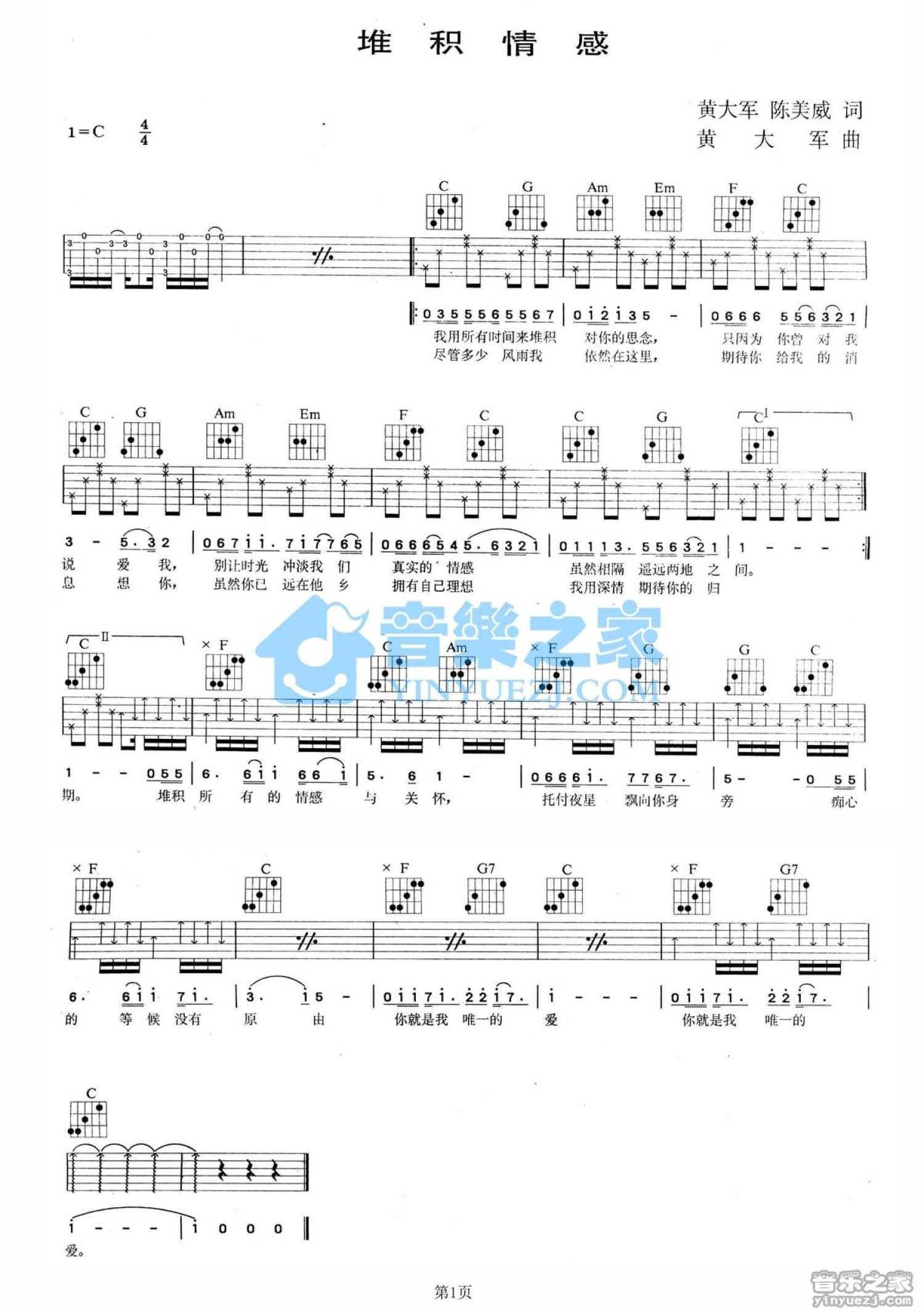 曲谱介绍: C调版黎明《堆积情感》吉他弹唱六线谱