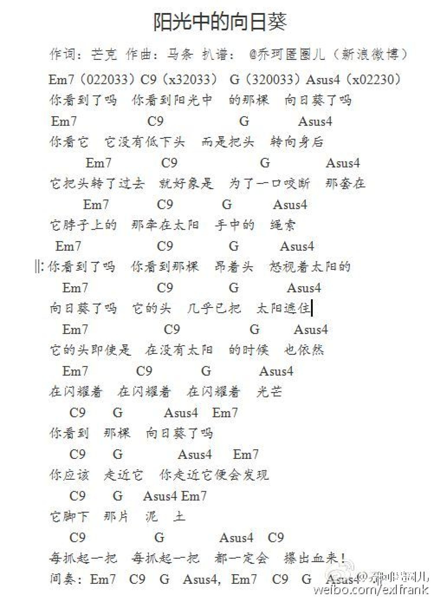 曲谱介绍: 马条《阳光中的向日葵》吉他和弦弹唱谱