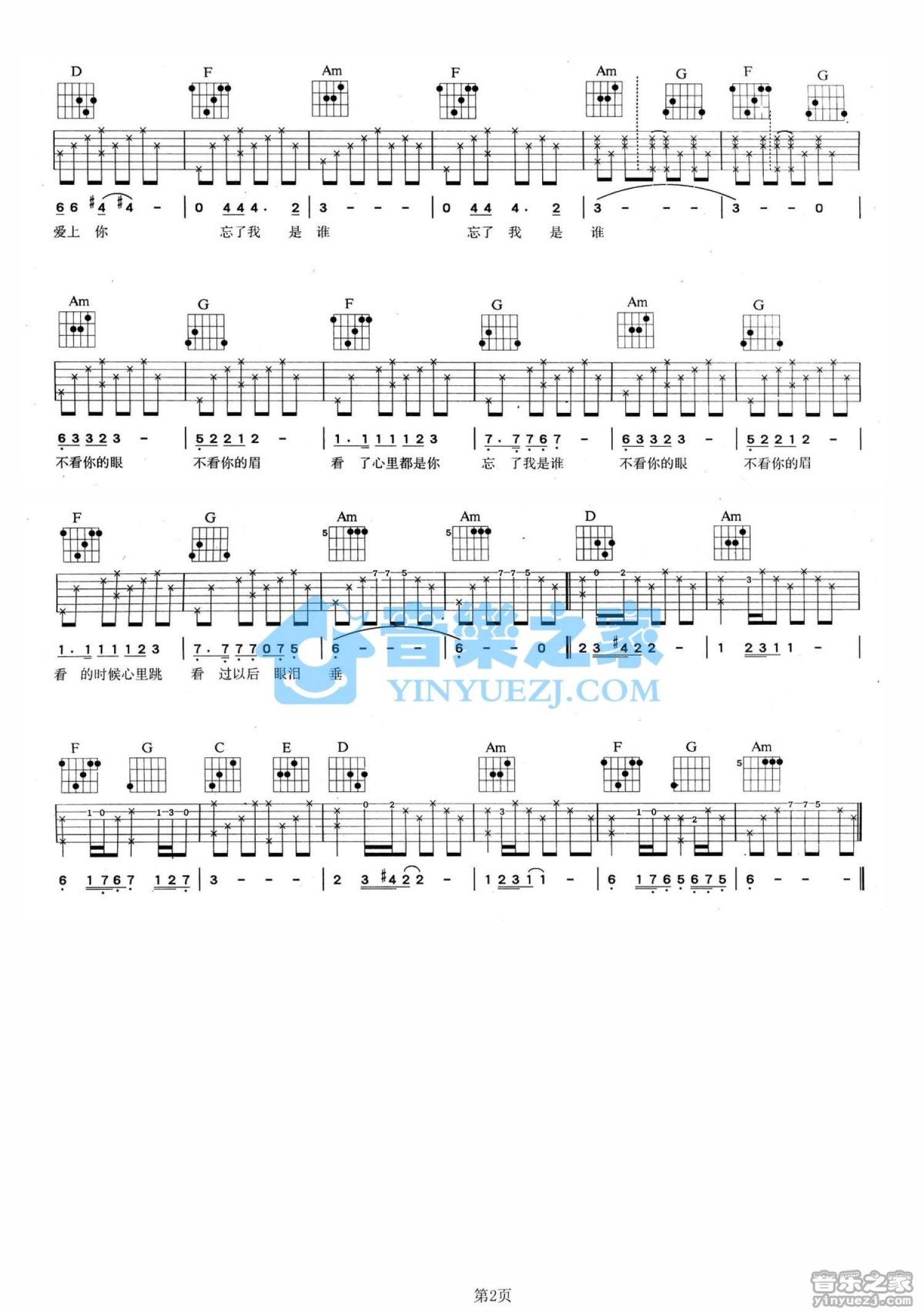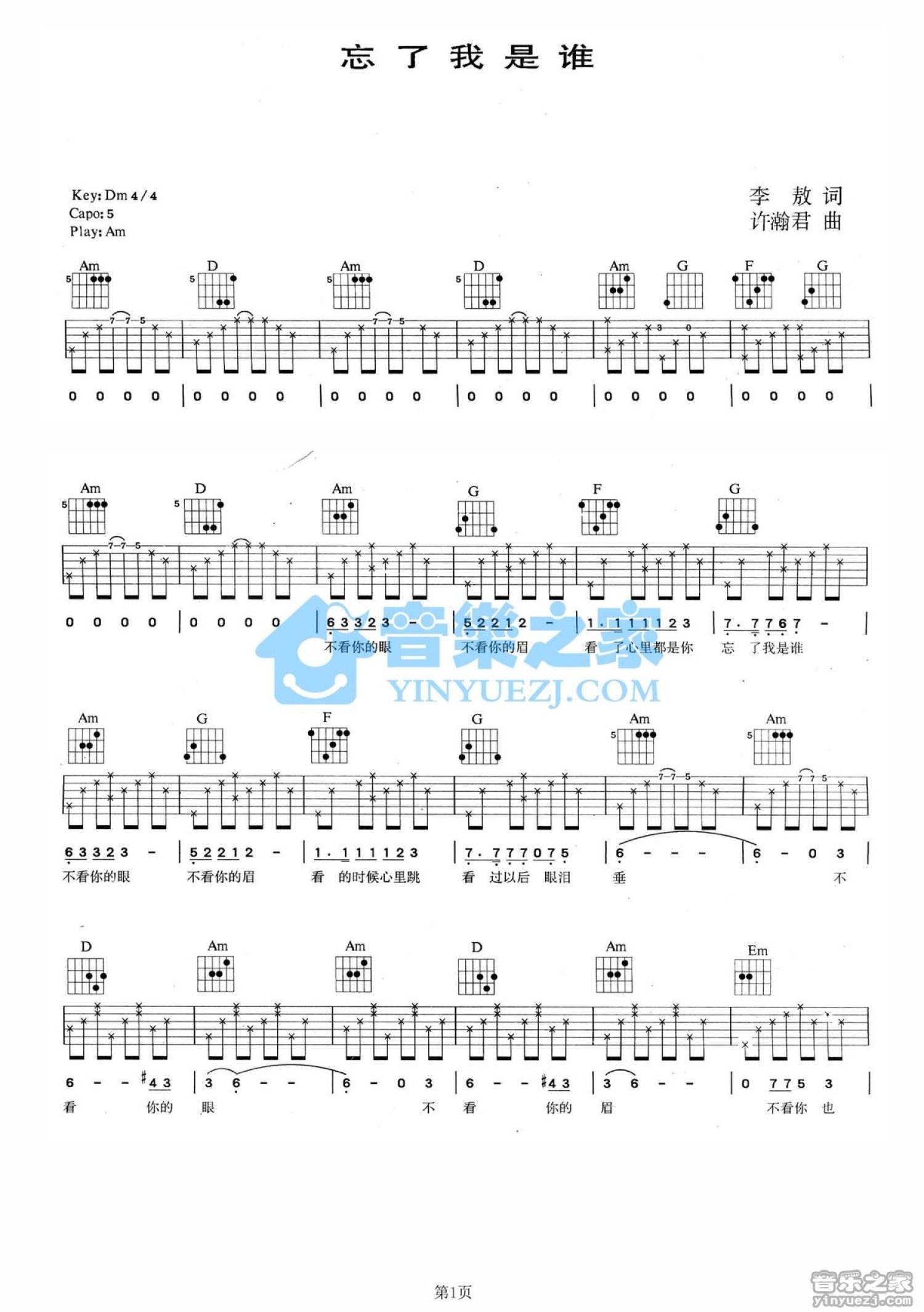 曲谱介绍: A调版黄莺莺《忘了我是谁》吉他弹唱六线谱