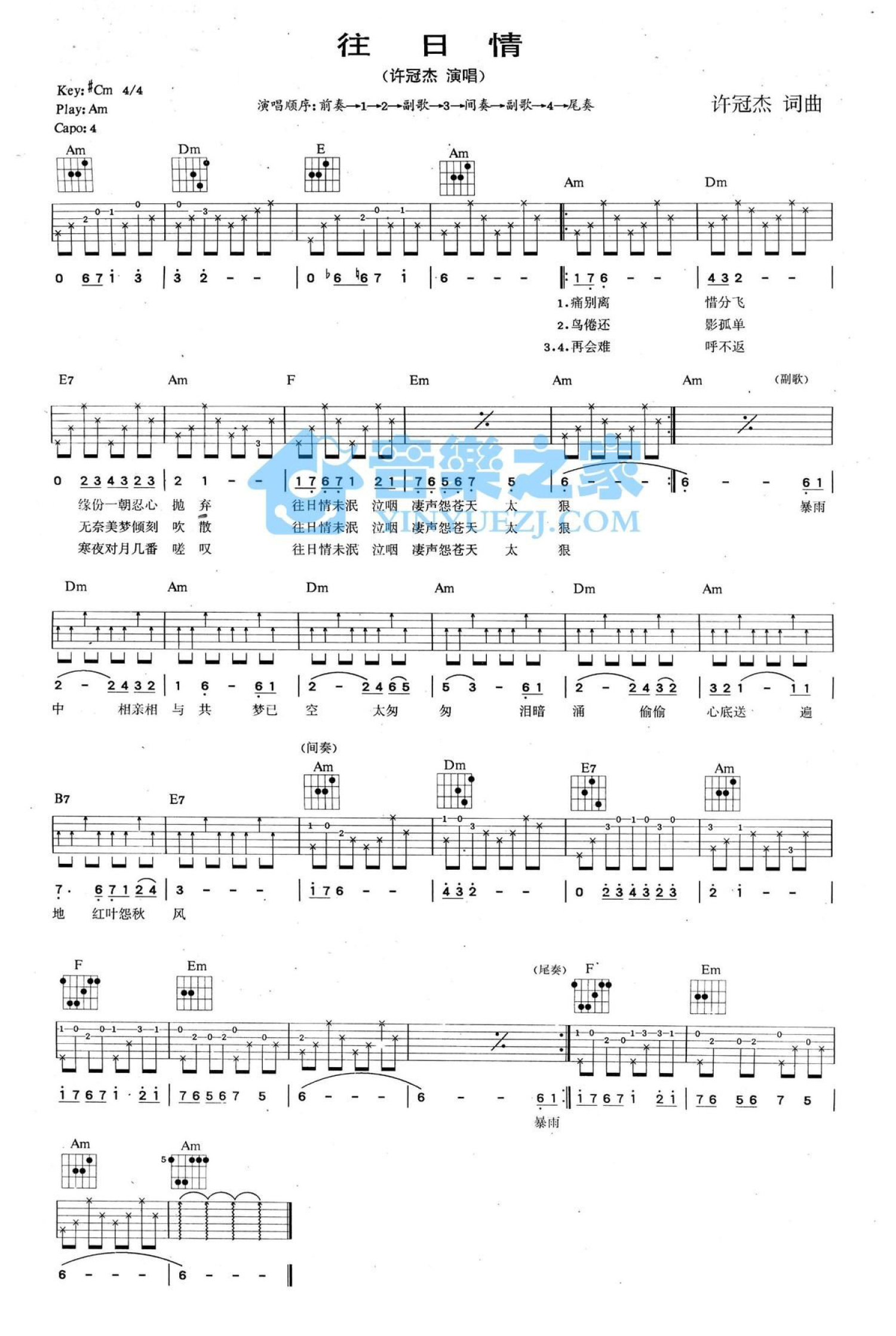 曲谱介绍: A调版《往日情》吉他弹唱六线谱