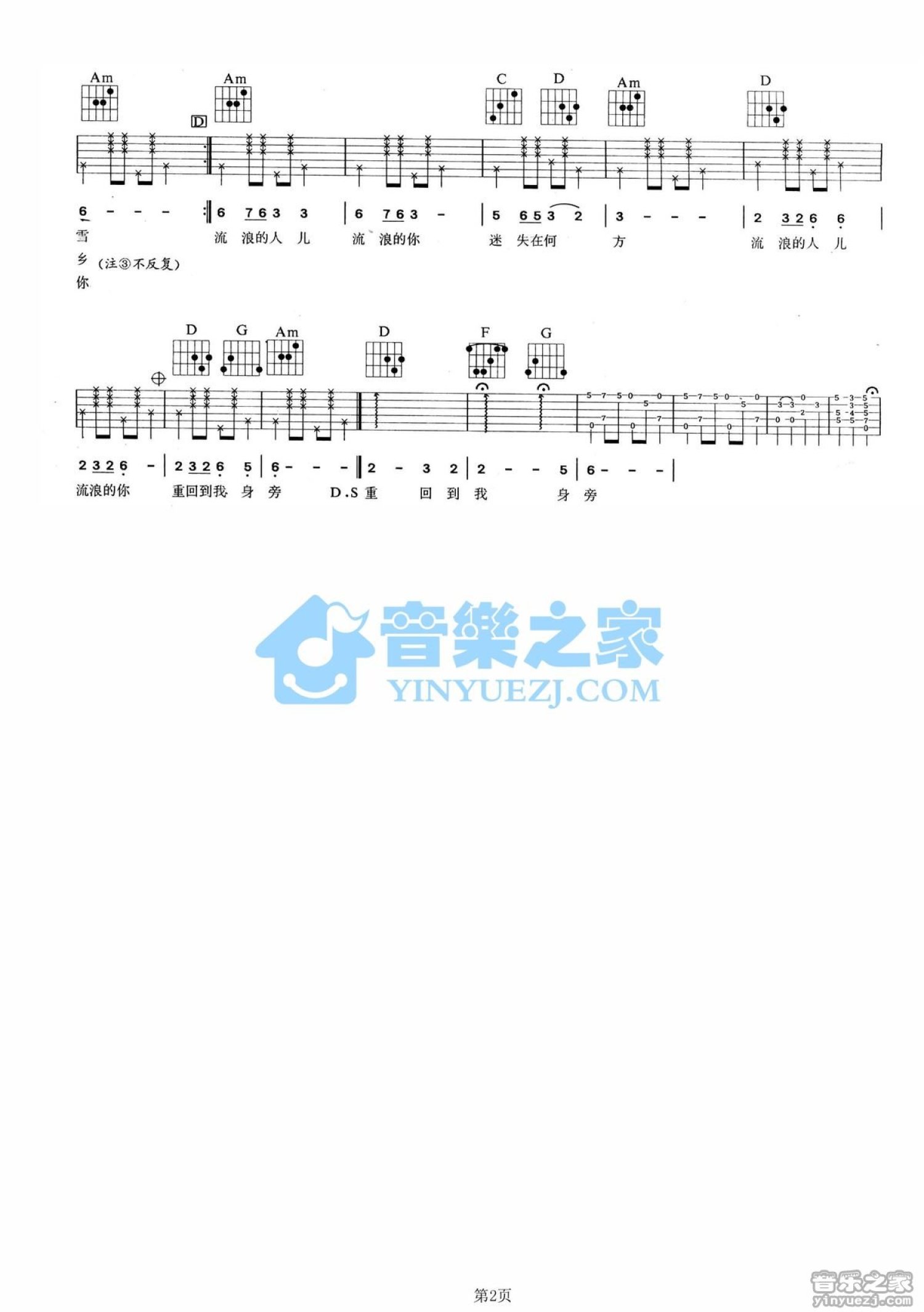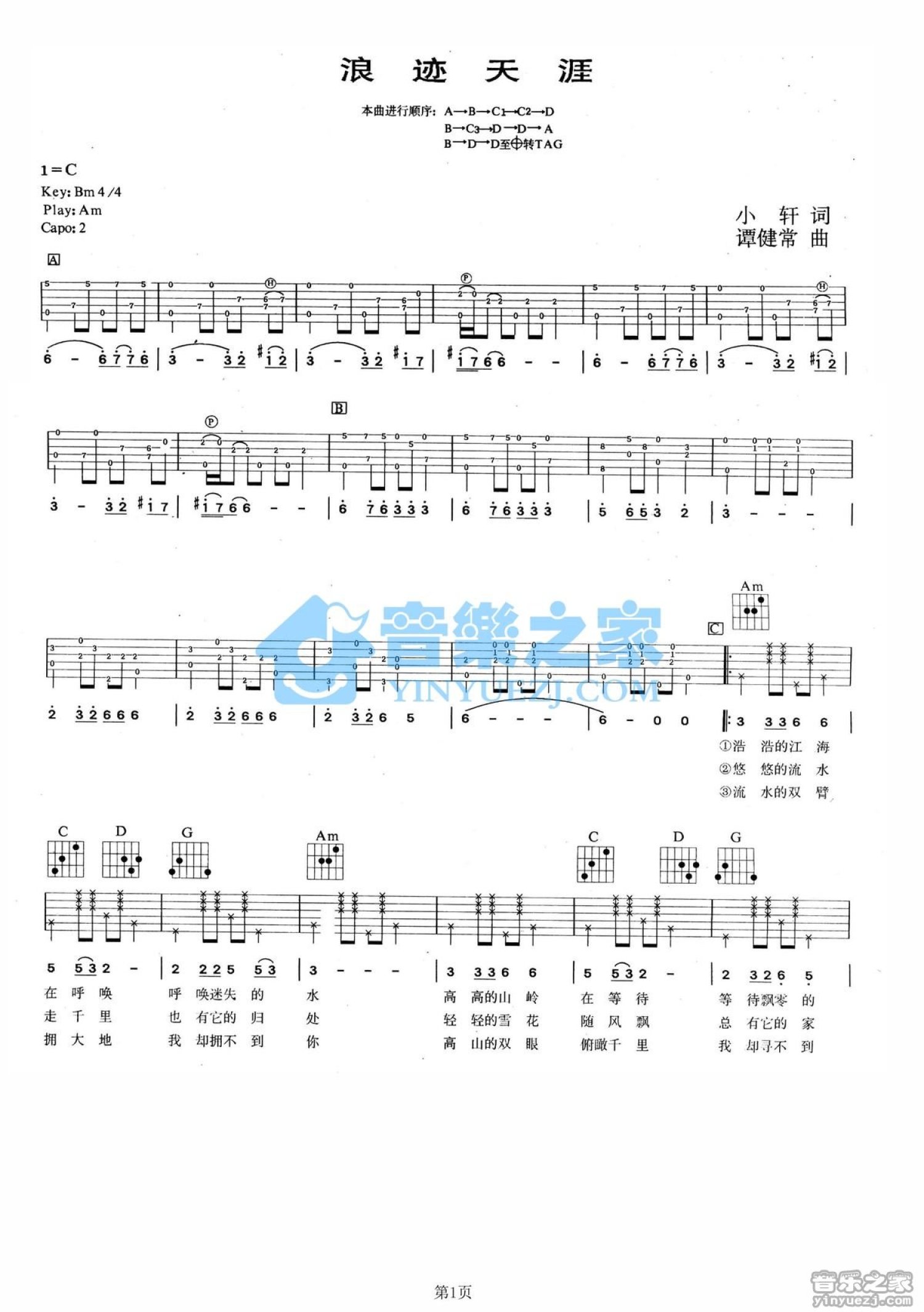 曲谱介绍: C调版《浪迹天涯》吉他弹唱六线谱