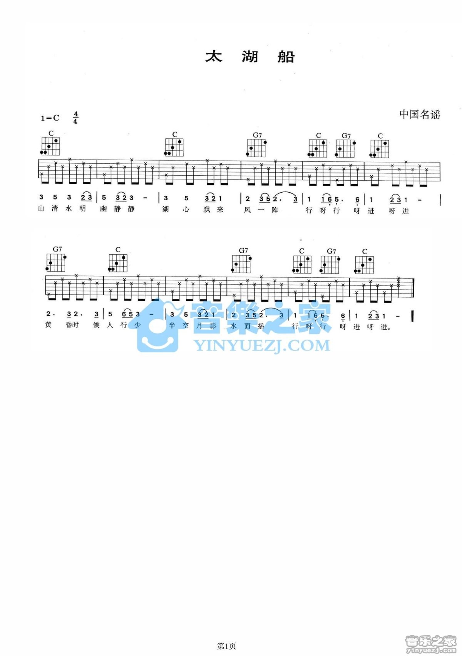 曲谱介绍: C调版童丽《太湖船》吉他弹唱六线谱
