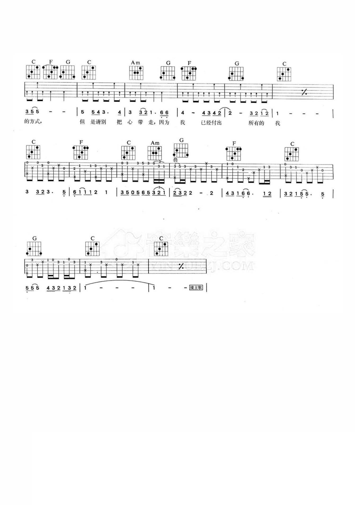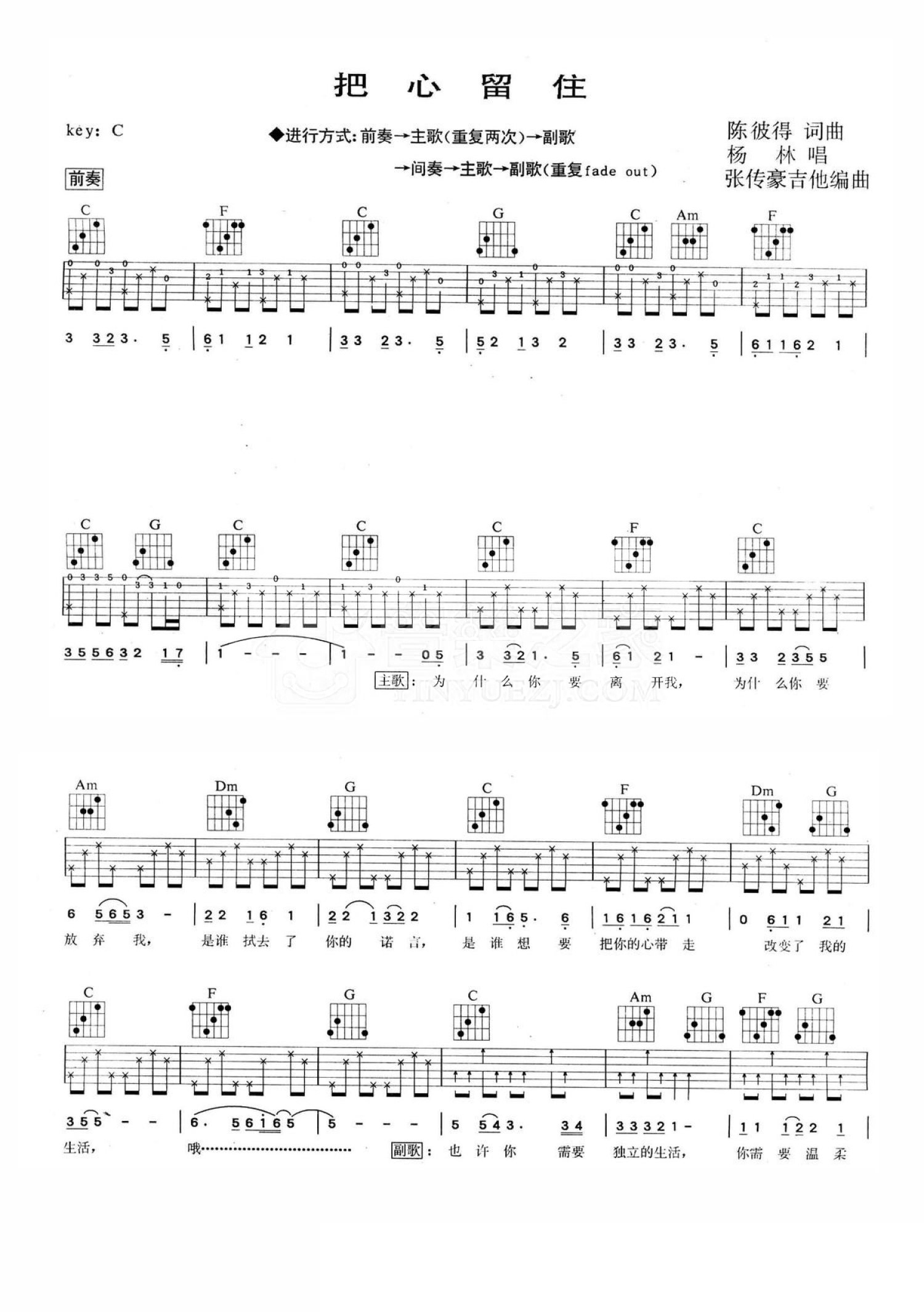 曲谱介绍: C调版杨林《把心留住》吉他弹唱六线谱