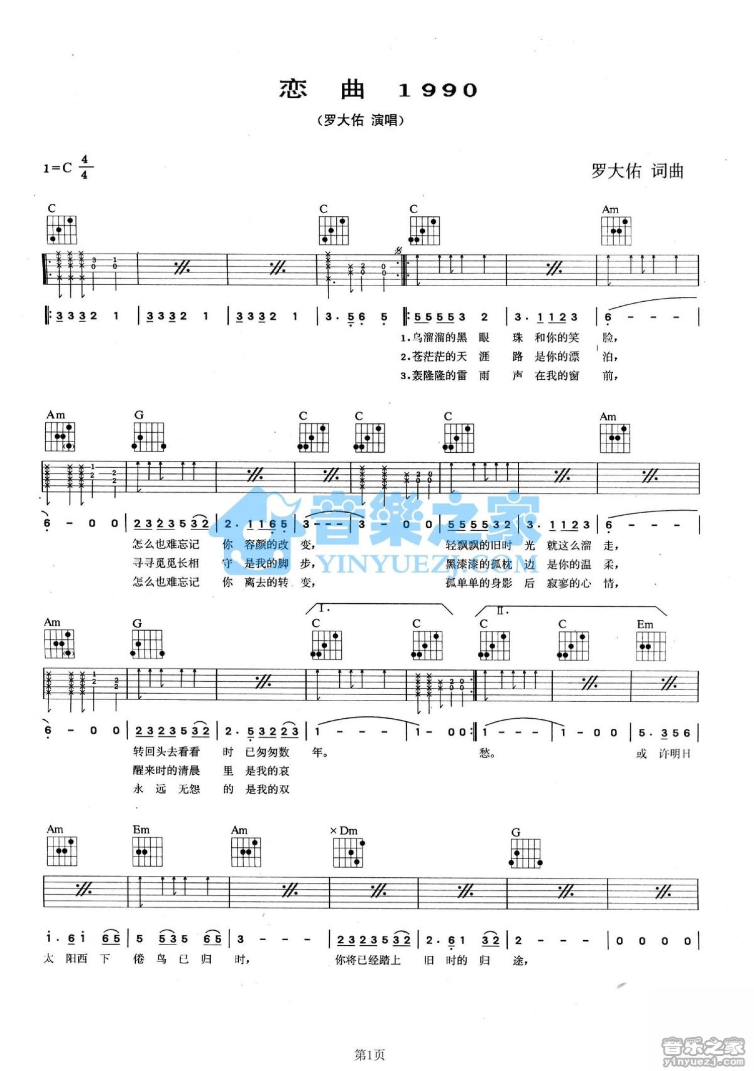 曲谱介绍: C调版罗大佑《恋曲》吉他弹唱六线谱